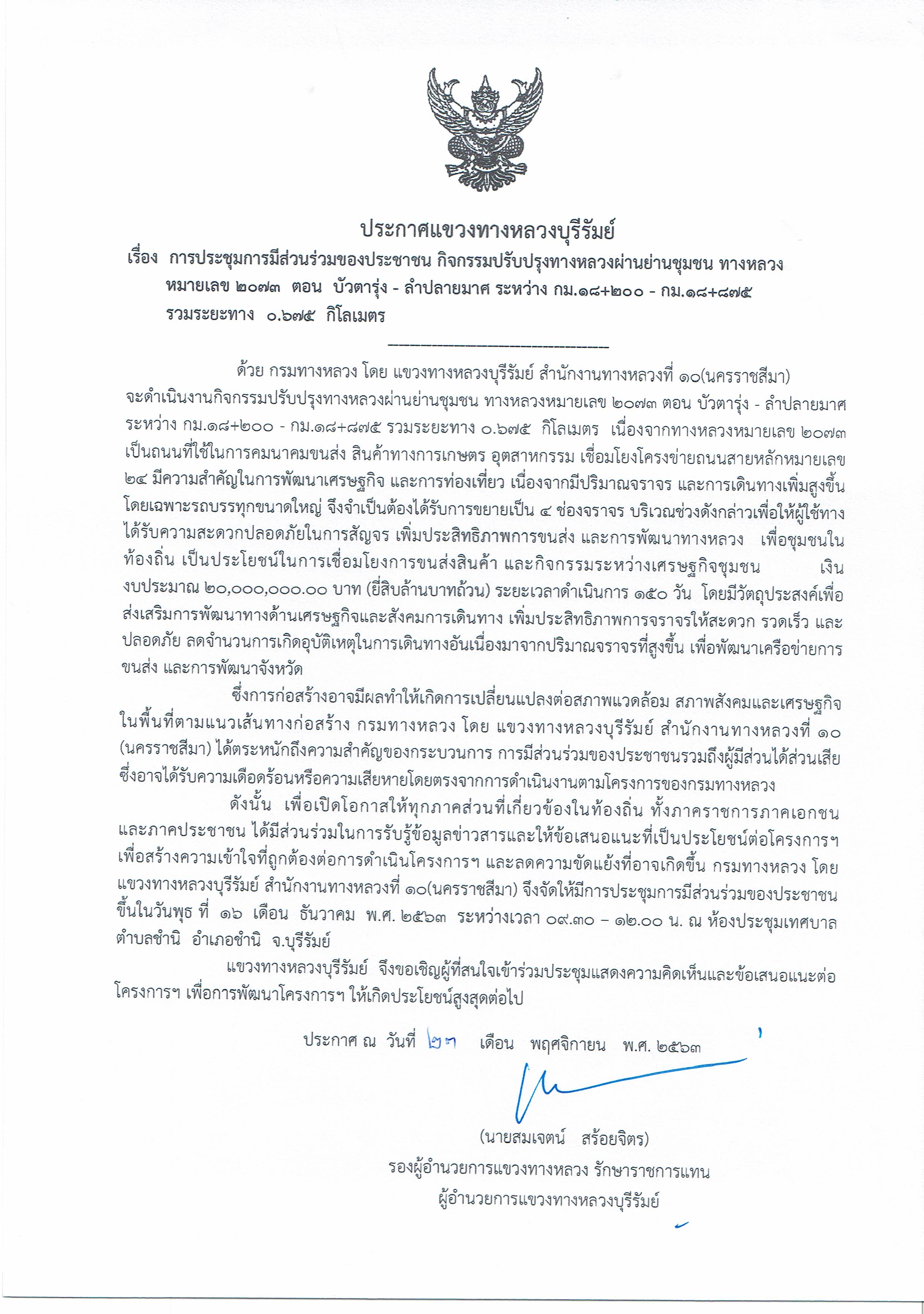 การประชุมการมีส่วนร่วมของประชาชน กิตกรรมปรับปรุงทางหลวงผ่านย่านชุมชน ทางหลวงหมายเลข 2073 ตอน บัวตารุ่ง - ลำปลายมาศ ระหว่าง กม.18+200 - กม.18+875 รวมระยะทาง 0.675 กิโลเมตร