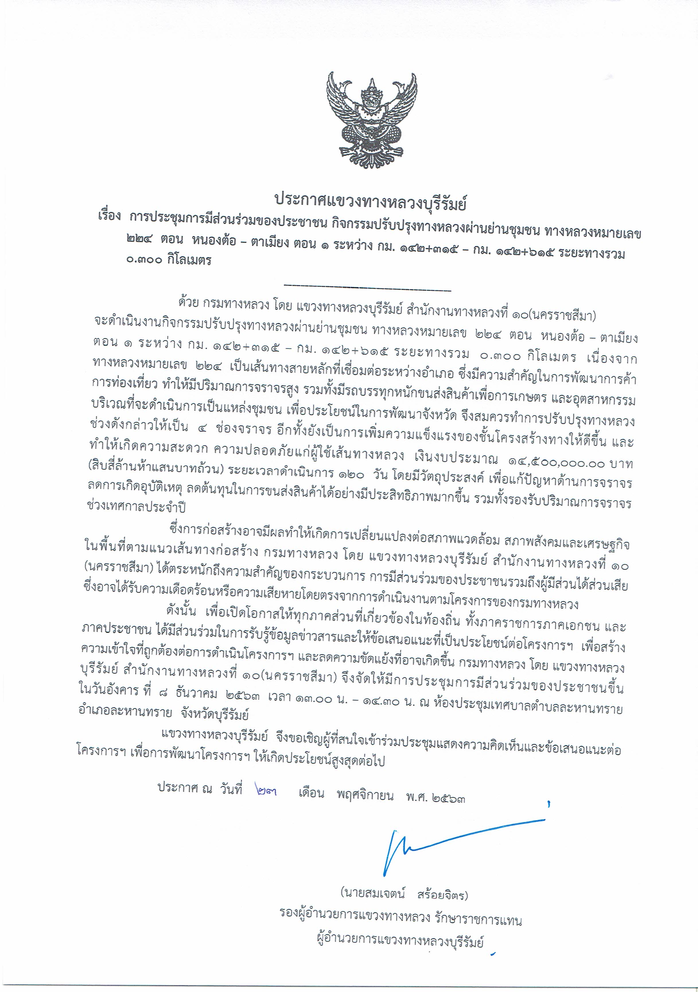 การประชุมการมีส่วนร่วมของประชาชน กิจกรรมปรับปรุงทางหลวงผ่านย่านชุมชน ทางหลวงหมายเลข 224 ตอน หนองต้อ - ตาเมียง ตอน 2 ระหว่าง กม.148+965 - กม.149+430 รวมระยะทาง 0.465 กิโลเมตร
