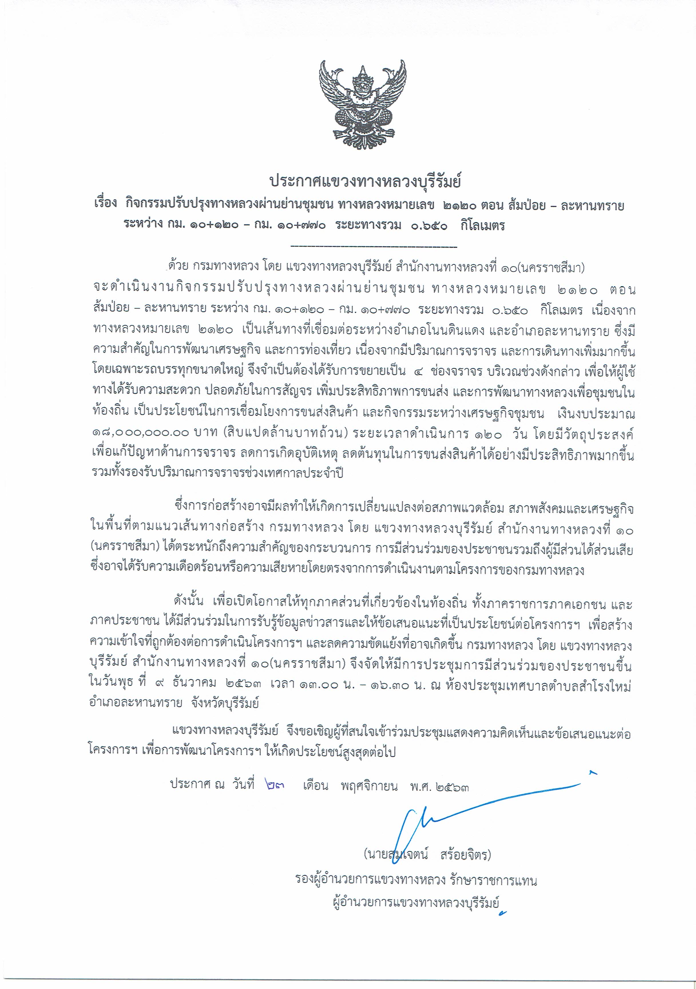 การประชุมการมีส่วนร่วมของประชาชน กิจกรรมปรับปรุงทางหลวงผ่านย่านชุมชน ทางหลวงหมายเลข 2120 ตอน ส้มป่อย - ละหานทราย ระหว่าง กม.10+120 - กม.10+770 รวมระยะทาง 0.650 กิโลเมตร