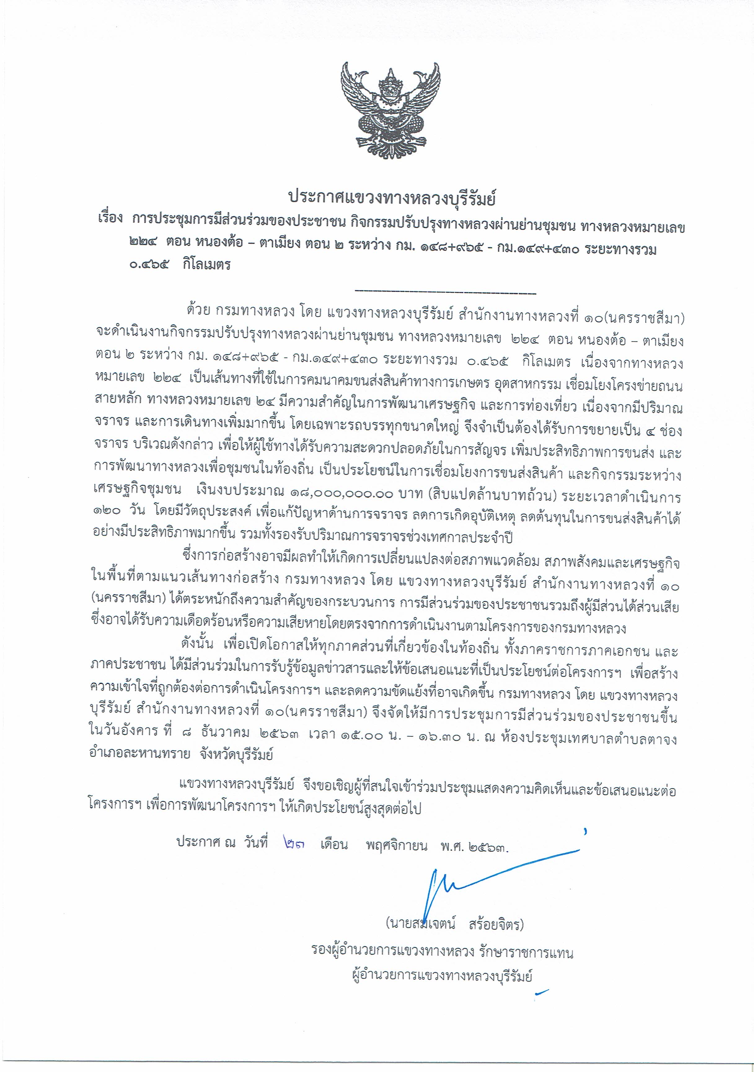 การประชุมการมีส่วนร่วมของประชาชน กิจกรรมปรับปรุงทางหลวงผ่านย่านชุมชน ทางหลวงหมายเลข 224 ตอน หนองต้อ - ตาเมียง ตอน 1 ระหว่าง กม.142+315 - กม.142+615 รวมระยะทาง 0.300 กิโลเมตร