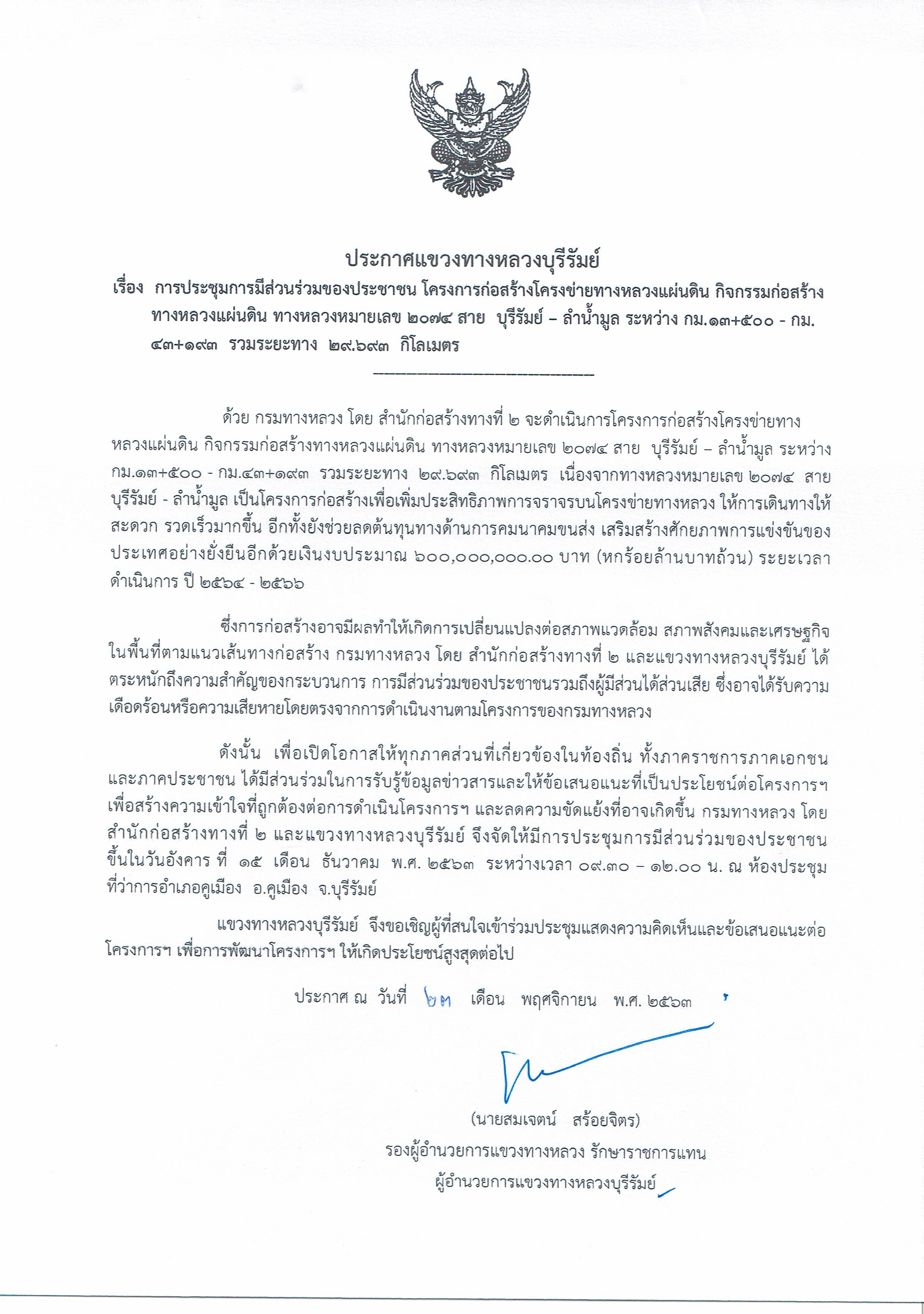การประชุมการมีส่วนร่วมของประชาชน กิจกรรมก่อสร้างทางหลวงแผ่นดิน ทางหลวงหมายเลข 2074 ตอน บุรีรัมย์ - ลำน้ำมูล ระหว่าง กม.13+500 - กม.43+193 รวมระยะทาง29.693กิโลเมตร