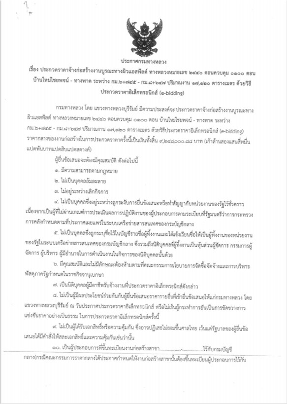 การประกวดราคาจ้างก่อสร้างงานบูรณะทางผิวแอสฟัลต์ ทางหลวงหมายเลข ๒๔๔๐ ตอนควบคุม ๐๑๐๐ ตอน บ้านใหม่ไชยพจน์ - ทางพาด ระหว่าง กม.๖+๗๔๕ - กม.๘+๖๔๗ ปริมาณงาน ๑๗,๑๒๐ ตารางเมตร