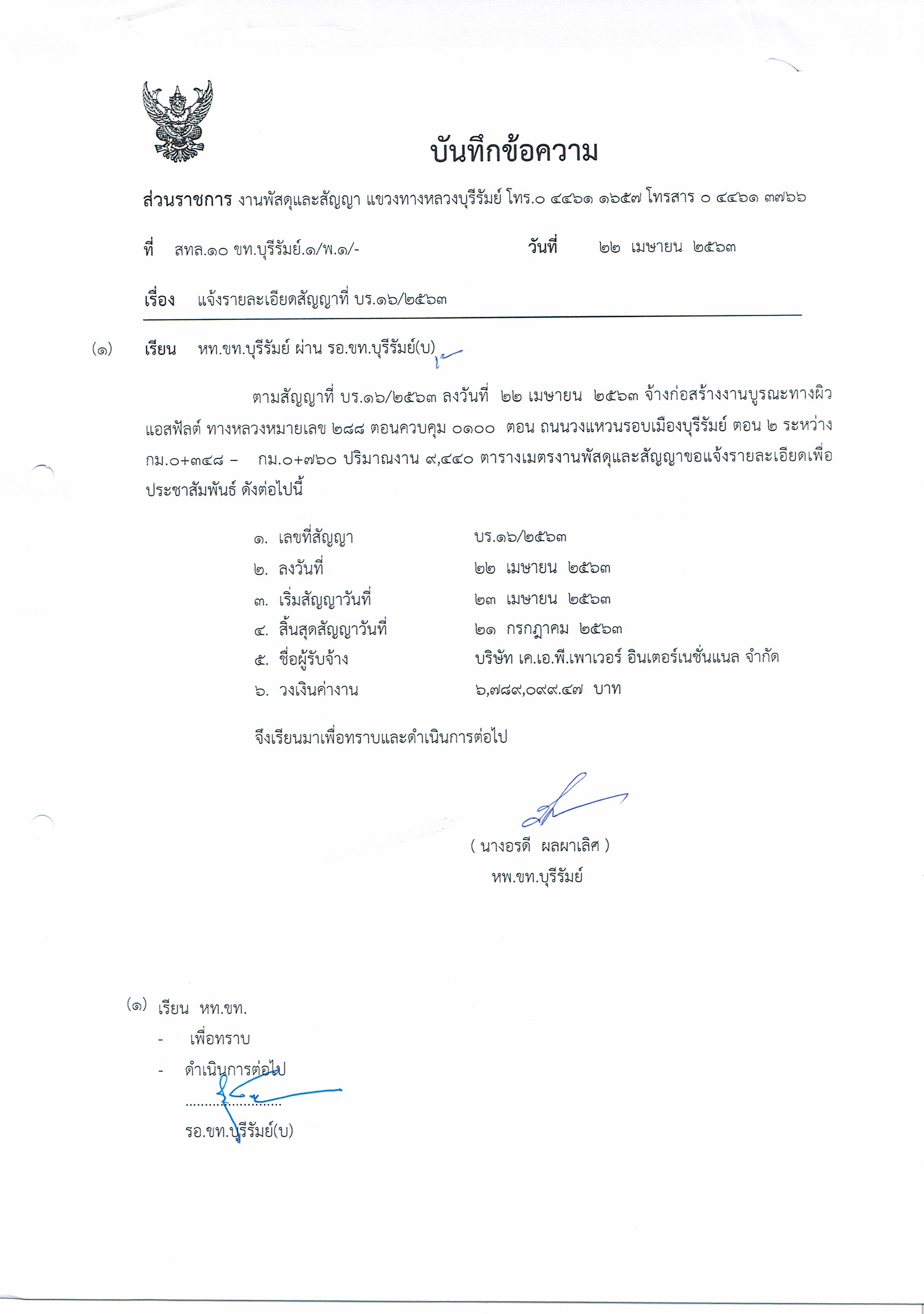 แจ้งรายละเอียดสัญญาที่ บร.๑๖/๒๕๖๓