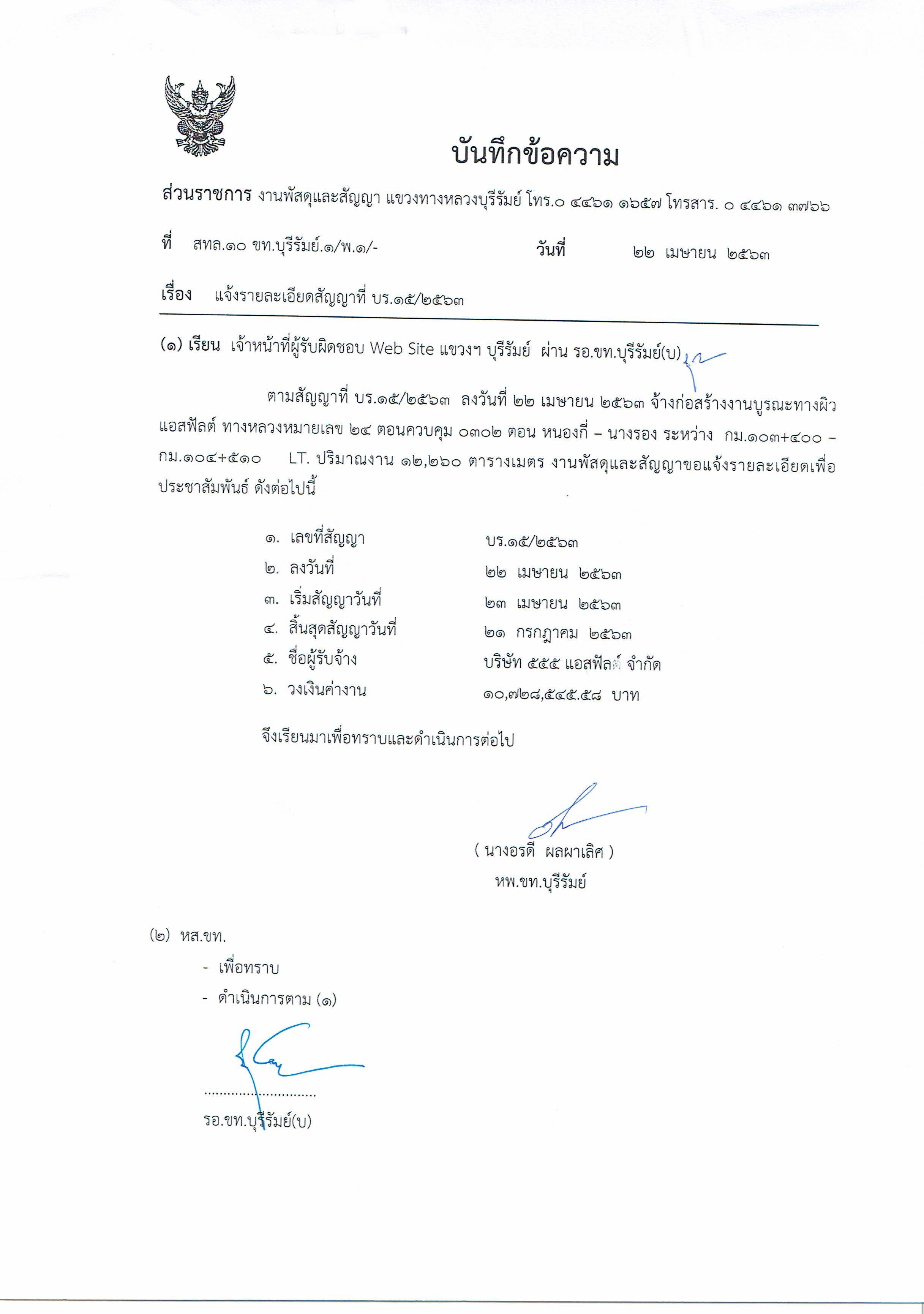แจ้งรายละเอียดสัญญาที่ บร.๑๕/๒๕๖๓
