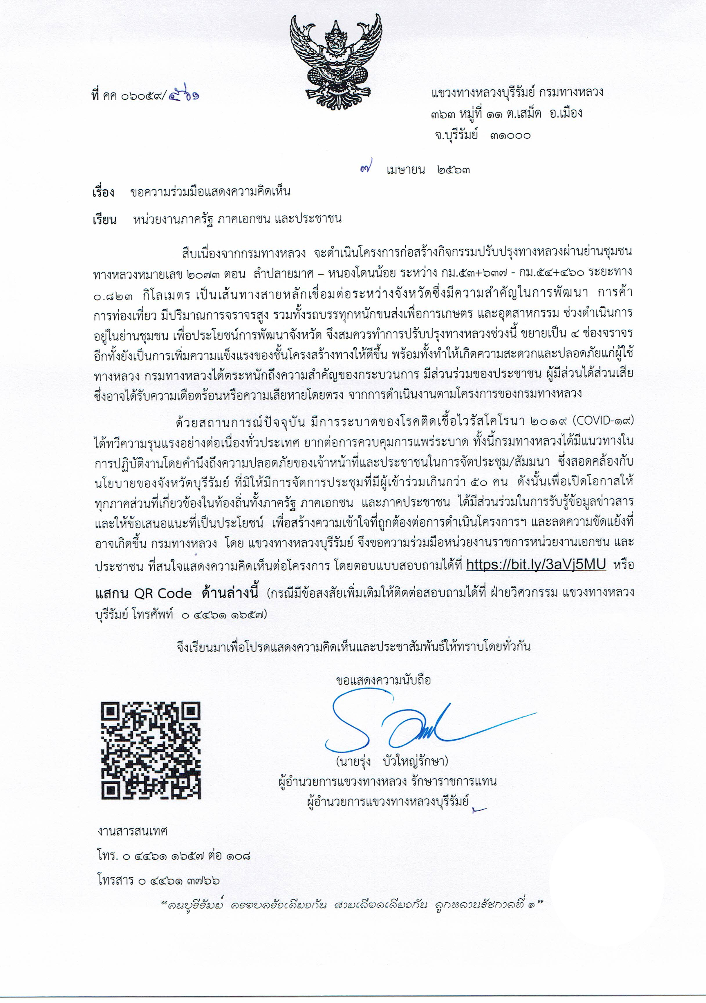 ขอเชิญชวนทุกท่านแสดงความคิดเห็นเกี่ยวกับโครงการก่อสร้างกิจกรรมปรับปรุงทางหลวงผ่านย่านชุมชน ทางหลวงหมายเลข 2073 ตอน ลำปลายมาศ – หนองโดนน้อย ระหว่าง กม.53+637 - กม.54+460 ระยะทาง 0.823 กิโลเมตร โดยตอบแบบสอบถามได้ที่ https://bit.ly/3aVj5MU หรือสแกนคิว QR Code ได้เลยครับ.