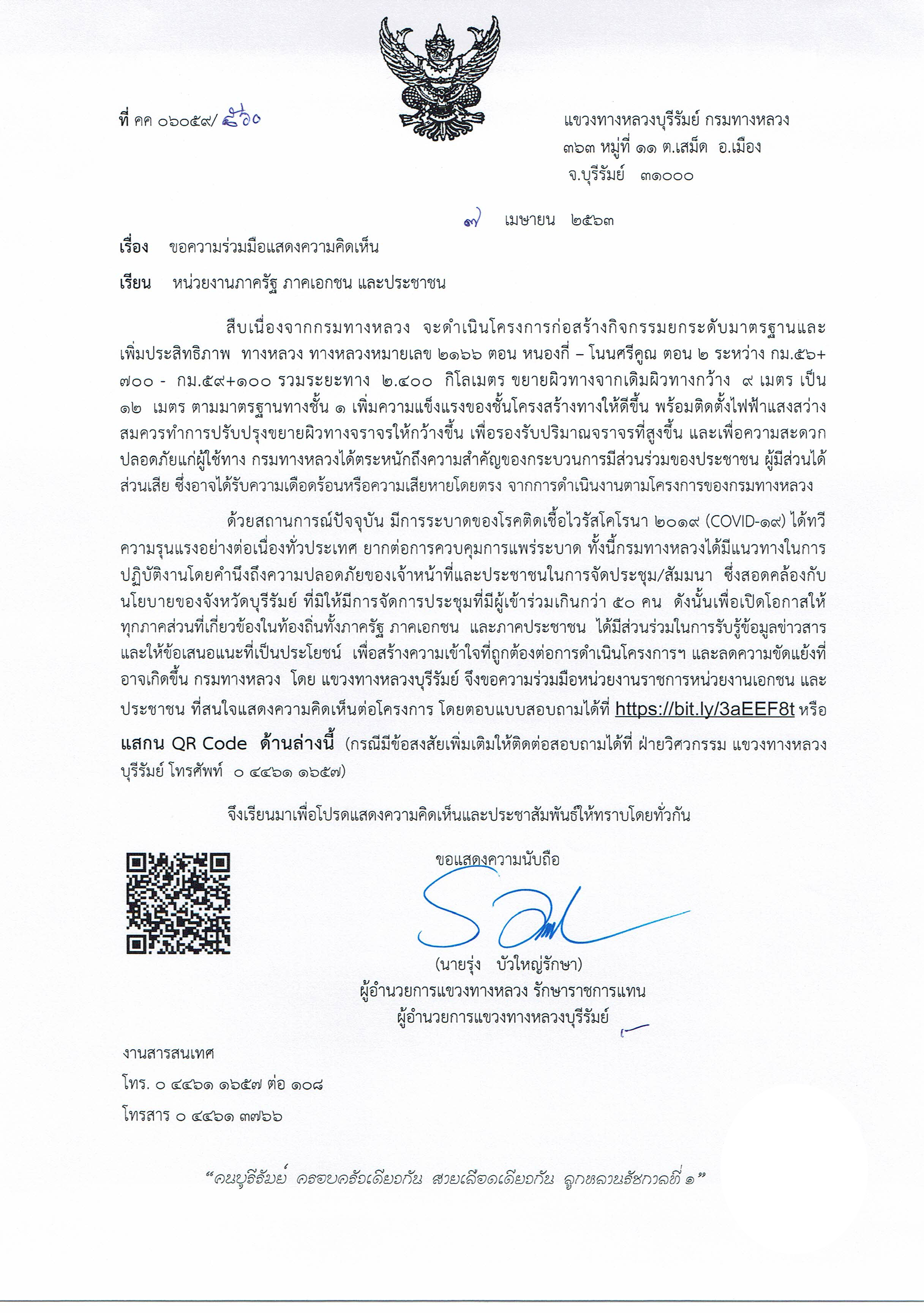 ขอเชิญชวนทุกท่านแสดงความคิดเห็นเกี่ยวกับโครงการก่อสร้างกิจกรรมยกระดับมาตรฐานและเพิ่มประสิทธิภาพทางหลวง ทางหลวงหมายเลข 2061 ตอน ห้วยตะกั่ว – พุทไธสง ระหว่าง กม.1+400 - กม.5+525 รวมระยะทาง 4.125 กิโลเมตร โดยตอบแบบสอบถามได้ที่ https://bit.ly/2UHD0cz หรือสแกนคิว QR Code