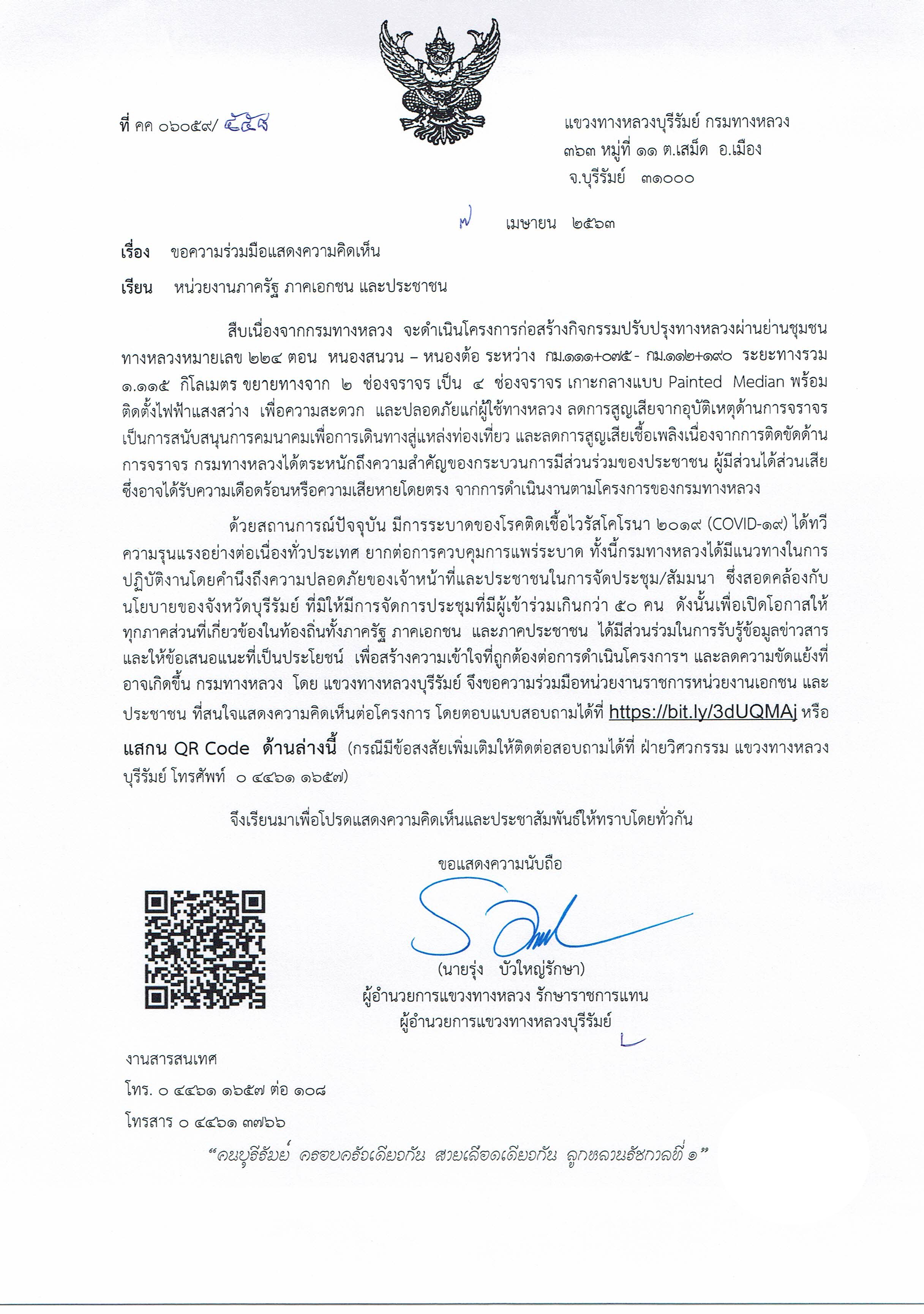 ขอเชิญชวนทุกท่านแสดงความคิดเห็นเกี่ยวกับโครงการก่อสร้างกิจกรรมปรับปรุงทางหลวงผ่านย่านชุมชน ทางหลวงหมายเลข 2074 ตอน ลำน้ำมูล – พุทไธสง ระหว่าง กม.54+925 - กม.55+700 รวมระยะทาง 0.775 กิโลเมตร โดยตอบแบบสอบถามได้ที่ https://bit.ly/34fBpOn หรือสแกนคิว QR Code