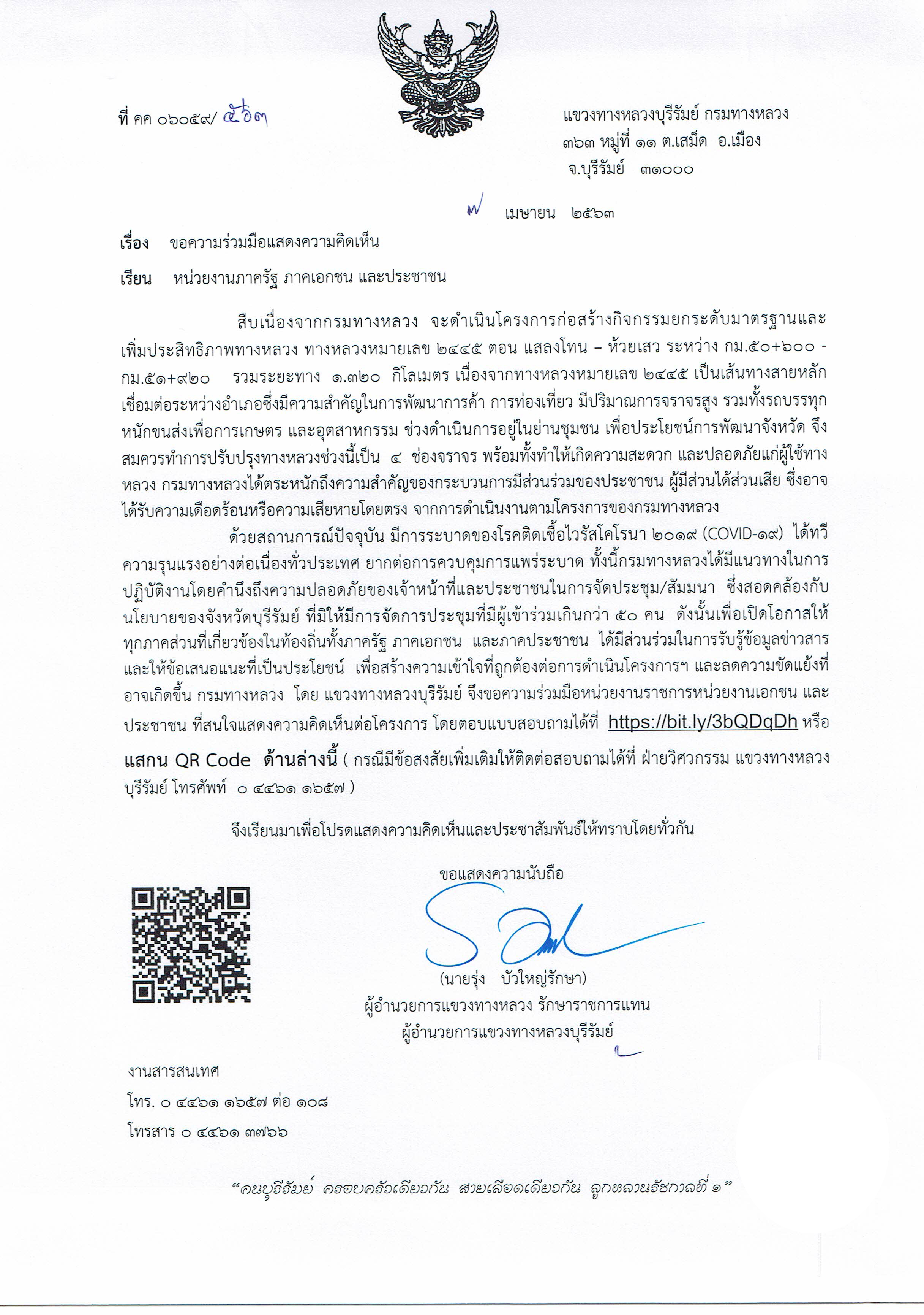 ขอเชิญชวนทุกท่านแสดงความคิดเห็นเกี่ยวกับโครงการก่อสร้างกิจกรรมปรับปรุงทางหลวงผ่านย่านชุมชน ทางหลวงหมายเลข 2073 ตอน ลำปลายมาศ – หนองโดนน้อย ระหว่าง กม.53+637 - กม.54+460 ระยะทาง 0.823 กิโลเมตร โดยตอบแบบสอบถามได้ที่ https://bit.ly/3aVj5MU หรือสแกนคิว QR Code