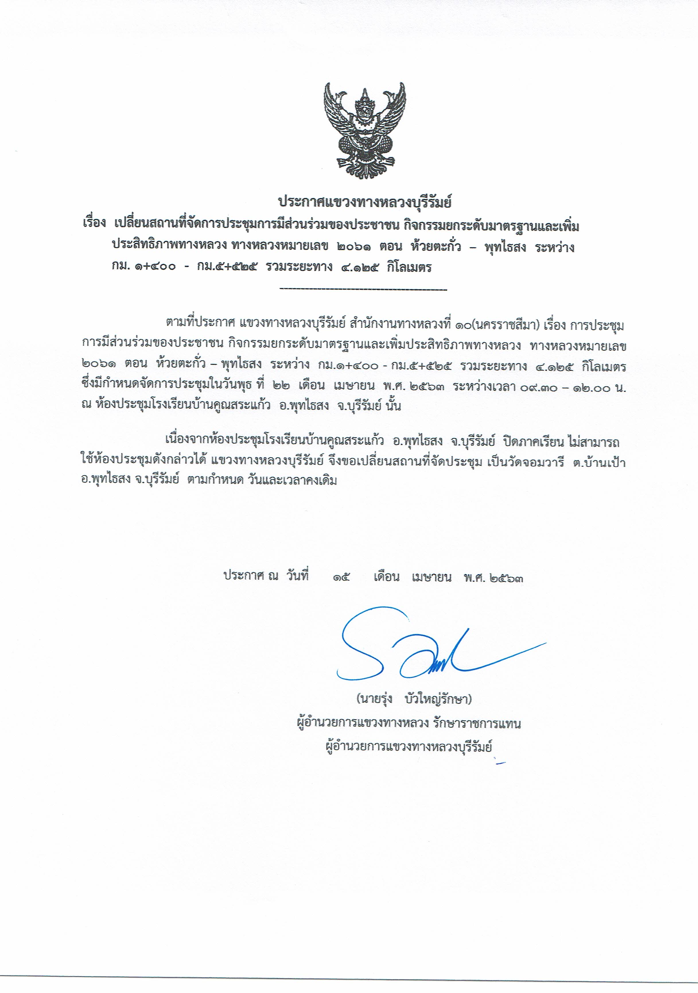 เปลื่ยนสถานที่จัดการประชุมการมีส่วนร่วมของประชาชน กิจกรรมยกระดับมาตรฐานและเพิ่มประสิทธิภาพทางหลวง ทางหลวงหมายเลข ๒๐๖๑ ตอน ห้วยตะกั่ว - พุทไธสง ระหว่าง กม.๑+๔๐๐ - กม.๕+๕๒๕ รวมระยะทาง ๔.๑๒๕ กิโลเมตร