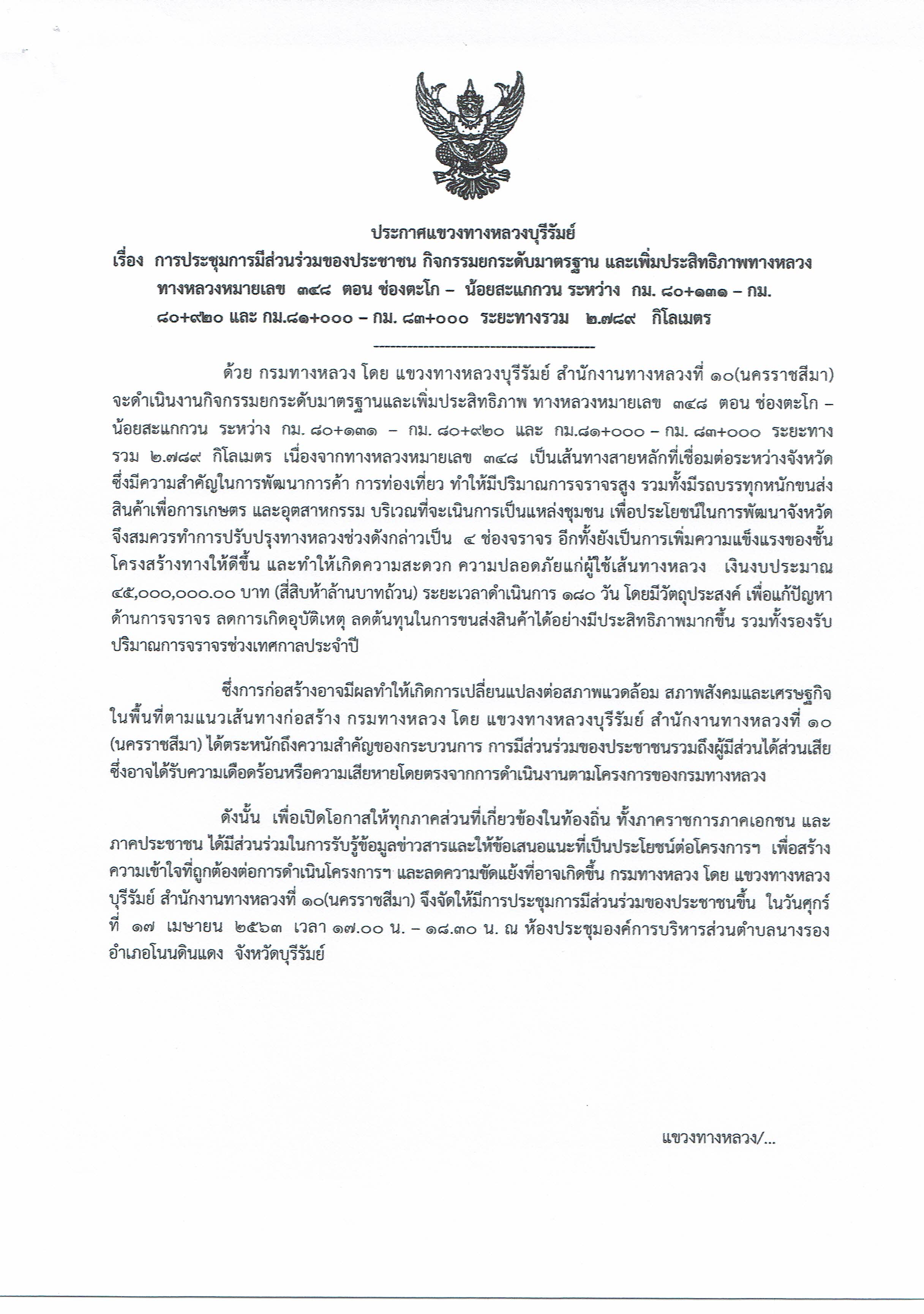 การประชุมการมีส่วนร่วมของประชาชน กิจกรรมยกระดับมาตรฐานและเพิ่มประสิทธิภาพทางหลวง ทางหลวงหมายเลข ๒๑๖๖ ตอน หนองกี่ - โนนศรีคูณ ตอน ๑ ระหว่าง กม.๓๕+๓๐๐ - กม.๓๖+๔๐๐ รวมระยะทาง ๑.๑๐๐ กิโลเมตร