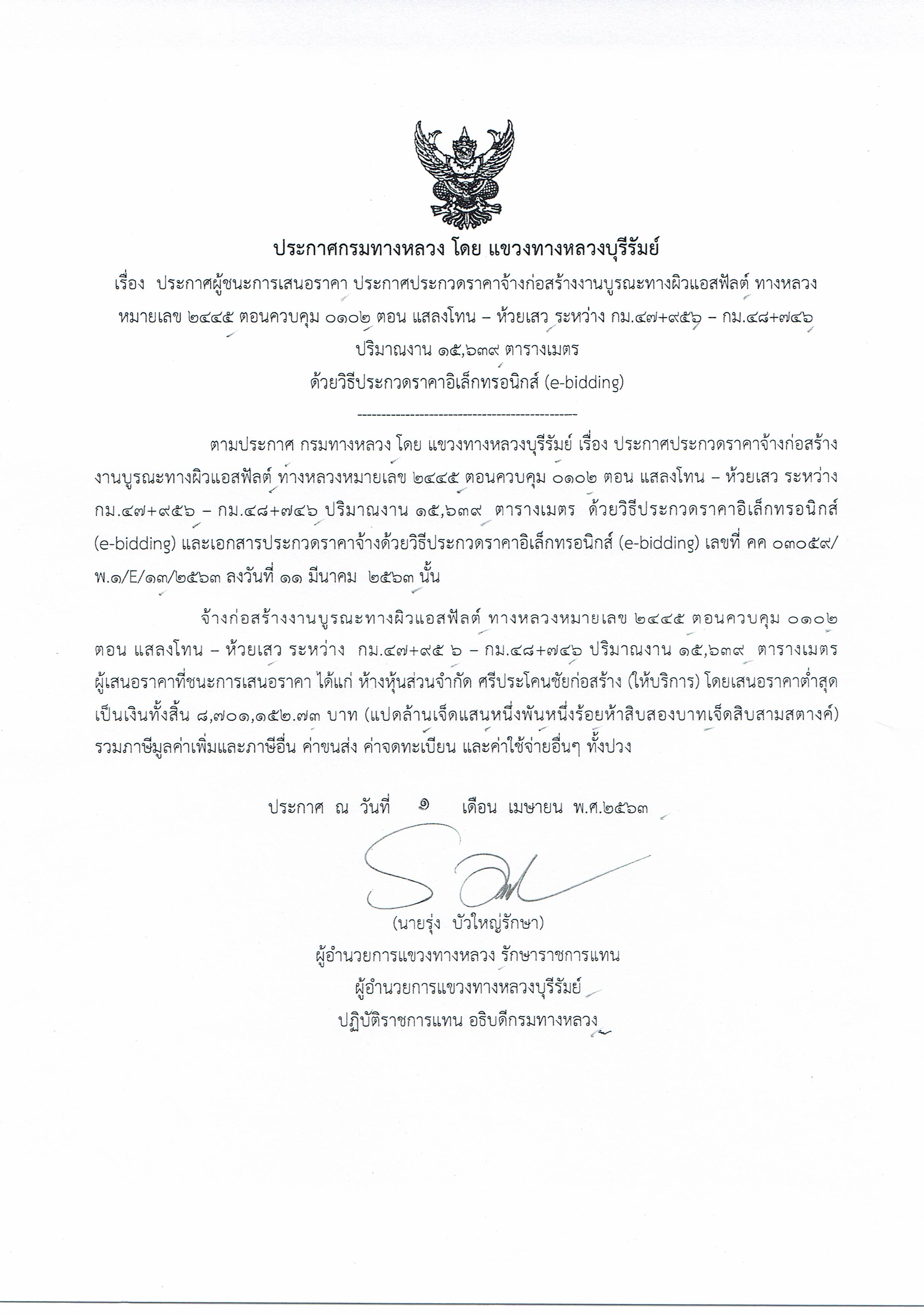 ประกาศผู้ชนะการเสนอราคา ประกาศประกวดราคาจ้างก่อสร้างงานบูรณะทางผิวแอสฟัลต์ ทางหลวงหมายเลข ๒๐๗๔ ตอนควบคุม ๐๑๐๒ ตอน คูเมือง - ลำน้ำมูล ระหว่าง กม.๕๐+๙๗๓ - กม.๕๑+๗๐๐ ปริมาณงาน ๑๖,๒๘๐ ตารางเมตร ด้วยวิธีประกวดราคาอิเล็กทรอนิกส์ (e-bidding)
