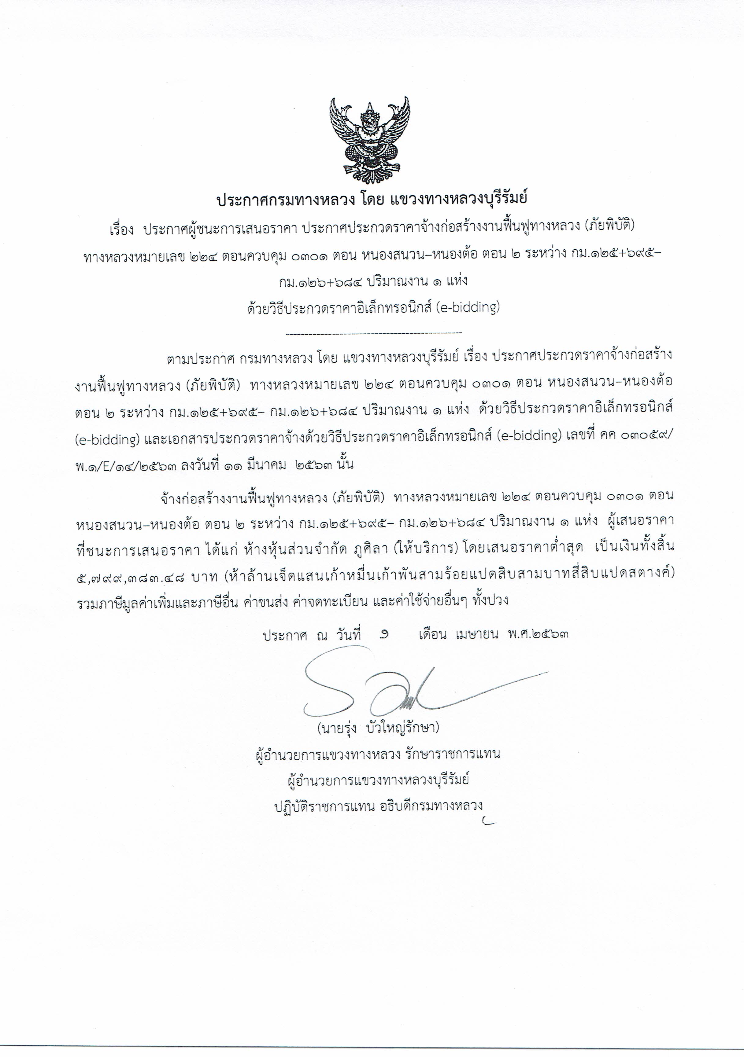 ประกาศผู้ชนะการเสนอราคา ประกาศประกวดราคาจ้างก่อสร้างงานฟื้นฟูทางหลวง (ภัยพิบัติ) ทางหลวงหมายเลข ๒๒๔ ตอนควบคุม ๐๓๐๑ ตอน หนองสนวน-หนองต้อ ตอน ๒ ระหว่าง กม.๑๒๕+๖๙๕-กม.๑๒๖+๖๘๔ ปริมาณ ๑ แห่ง ด้วยวิธีประกวดราคาอิเล็กทรอนิกส์ (e-bidding)
