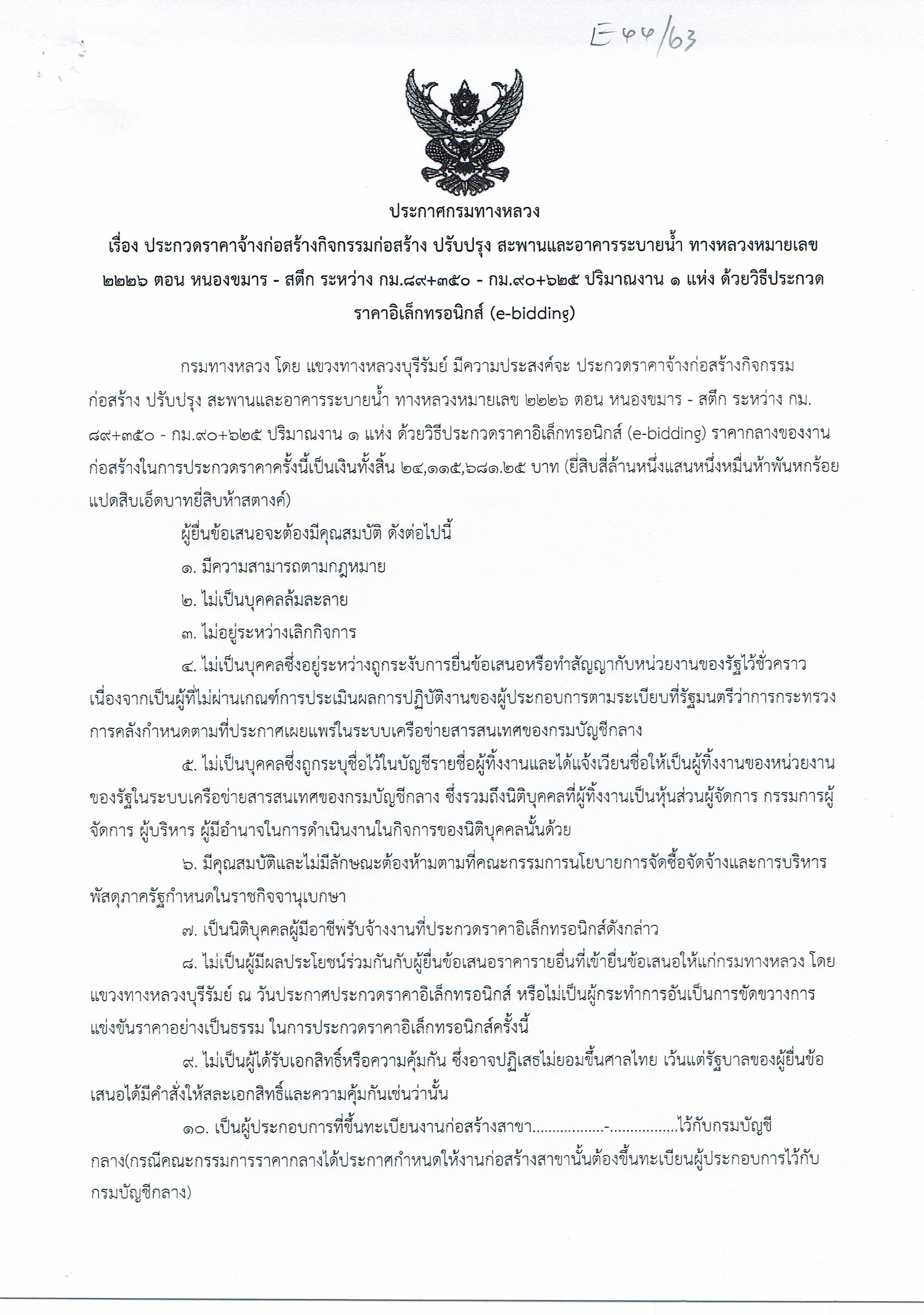 ประกวดราคาจ้างก่อสร้างกิจกรรมก่อสร้าง ปรับปรุง สะพานและอาคารระบายน้ำ ทางหลวงหมายเลข ๒๒๒๖ ตอน หนองขมาร - สตึก ระหว่าง กม.๘๙+๓๕๐ - กม.๙๐+๖๒๕ ปริมาณงาน ๑ แห่ง ด้วยวิธีประกวด ราคาอิเล็กทรอนิกส์ (e-bidding)