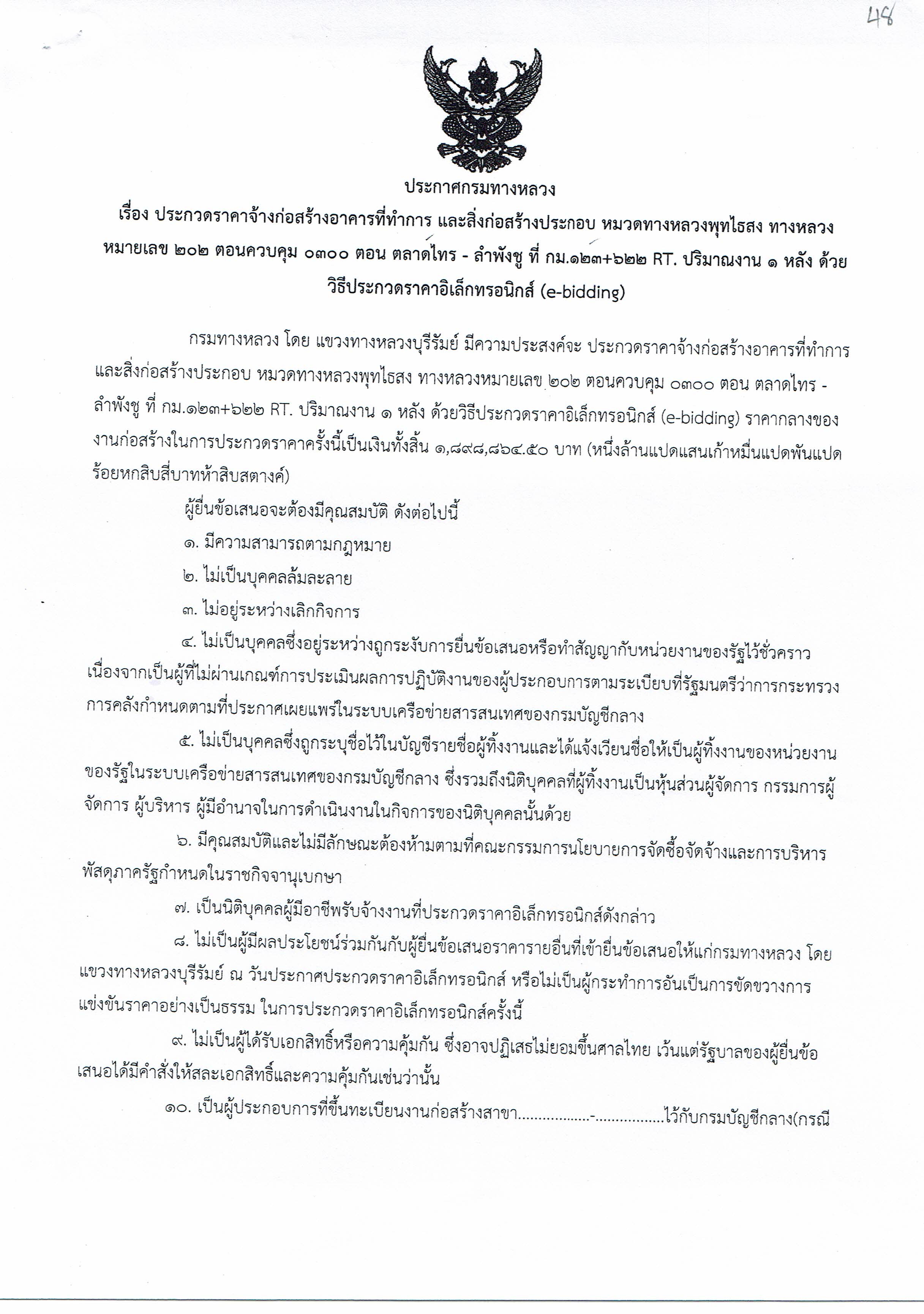 ประกวดราคาจ้างก่อสร้างอาคารที่ทำการ และสิ่งก่อสร้างประกอบ หมวดทางหลวงพุทไธสง ทางหลวงหมายเลข ๒๐๒ ตอนควบคุม ๐๓๐๐ ตอน ตลาดไทร - ลำพังชู ที่ กม.๑๒๓+๖๒๒ RT. ปริมาณงาน ๑ หลัง ด้วยวิธีประกวดราคาอิเล็กทรอนิกส์ (e-bidding)