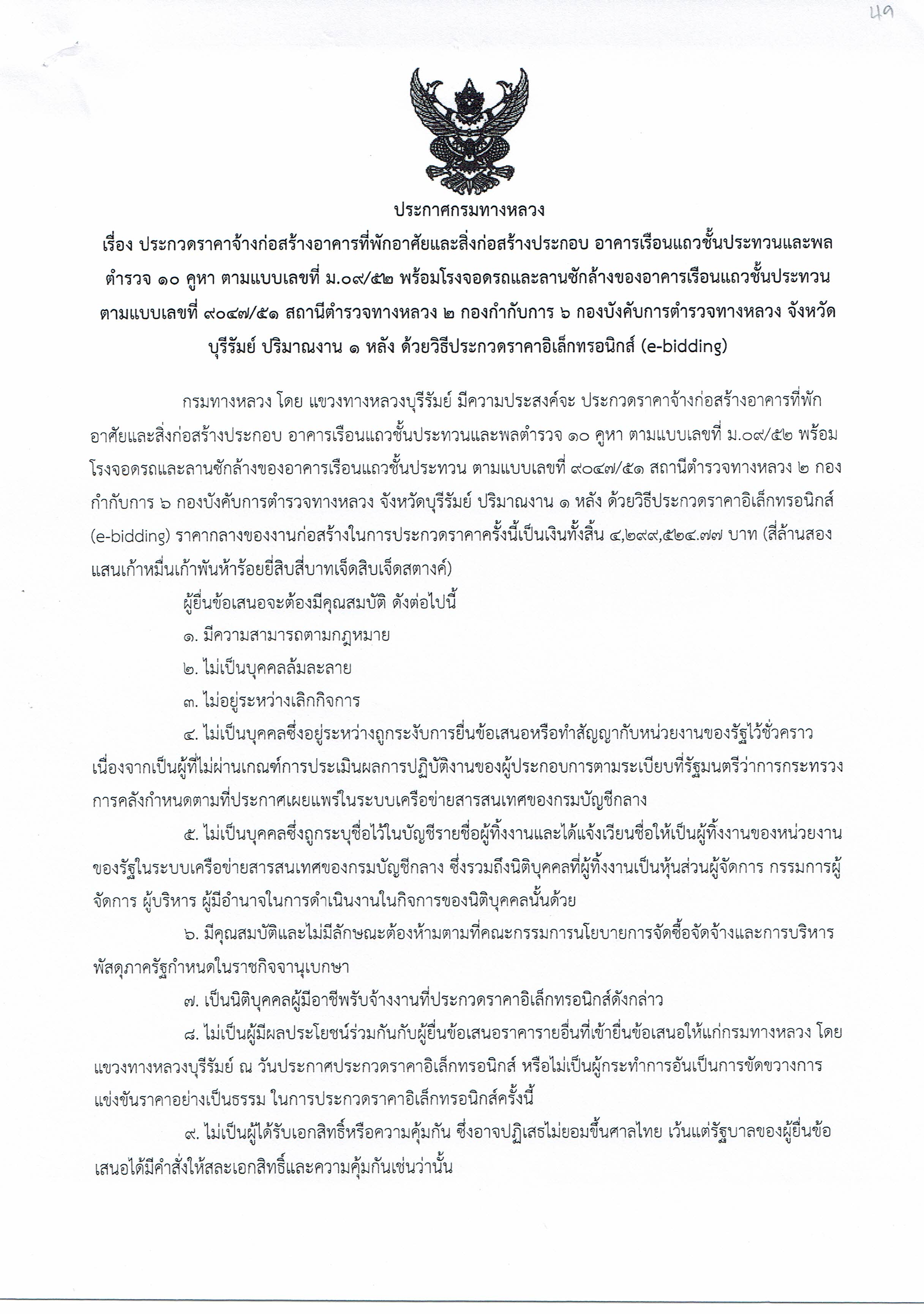 ประกวดราคาจ้างก่อสร้างอาคารที่พักอาศัยและสิ่งก่อสร้างประกอบ อาคารเรือนแถวชั้นประทวนและพลตำรวจ ๑๐ คูหา ตามแบบเลขที่ ม.๐๙/๕๒ พร้อมโรงจอดรถและลานซักล้างของอาคารเรือนแถวชั้นประทวนตามแบบเลขที่ ๙๐๔๗/๕๑ สถานีตำรวจทางหลวง ๒ กองกำกับการ ๖ กองบังคับการตำรวจทางหลวง จังหวัดบุรีรัมย์ ปริมาณงาน ๑ หลัง ด้วยวิธีประกวดราคาอิเล็กทรอนิกส์ (e-bidding)