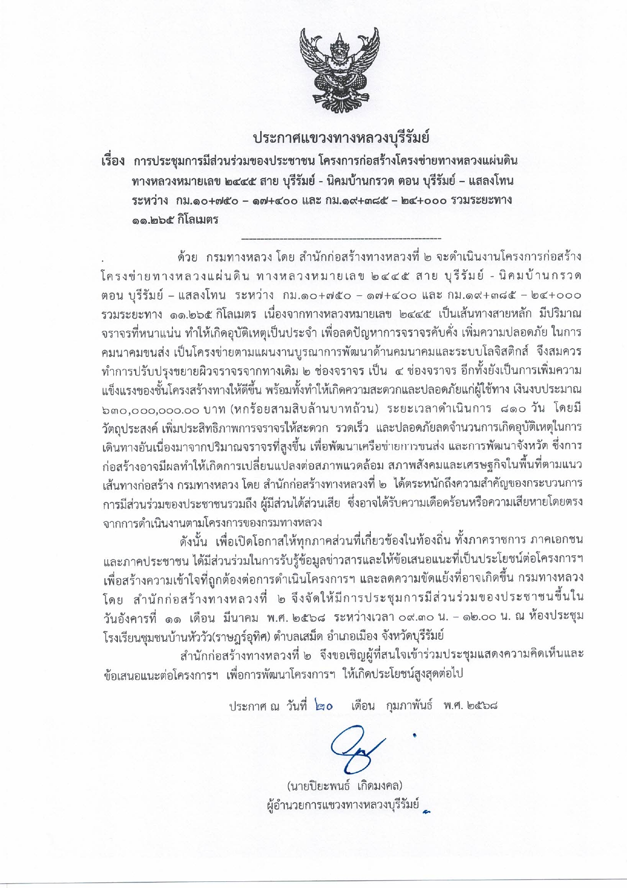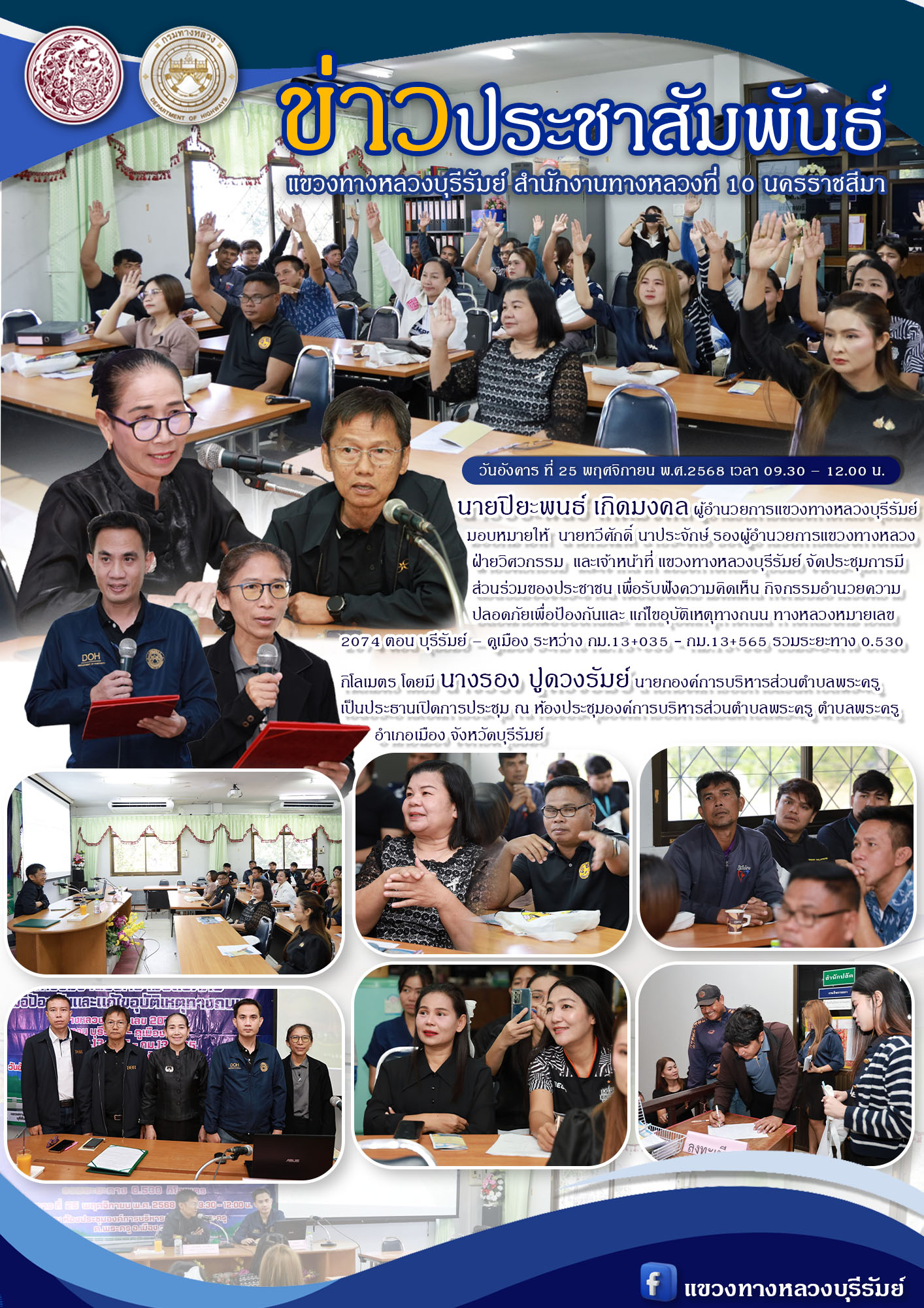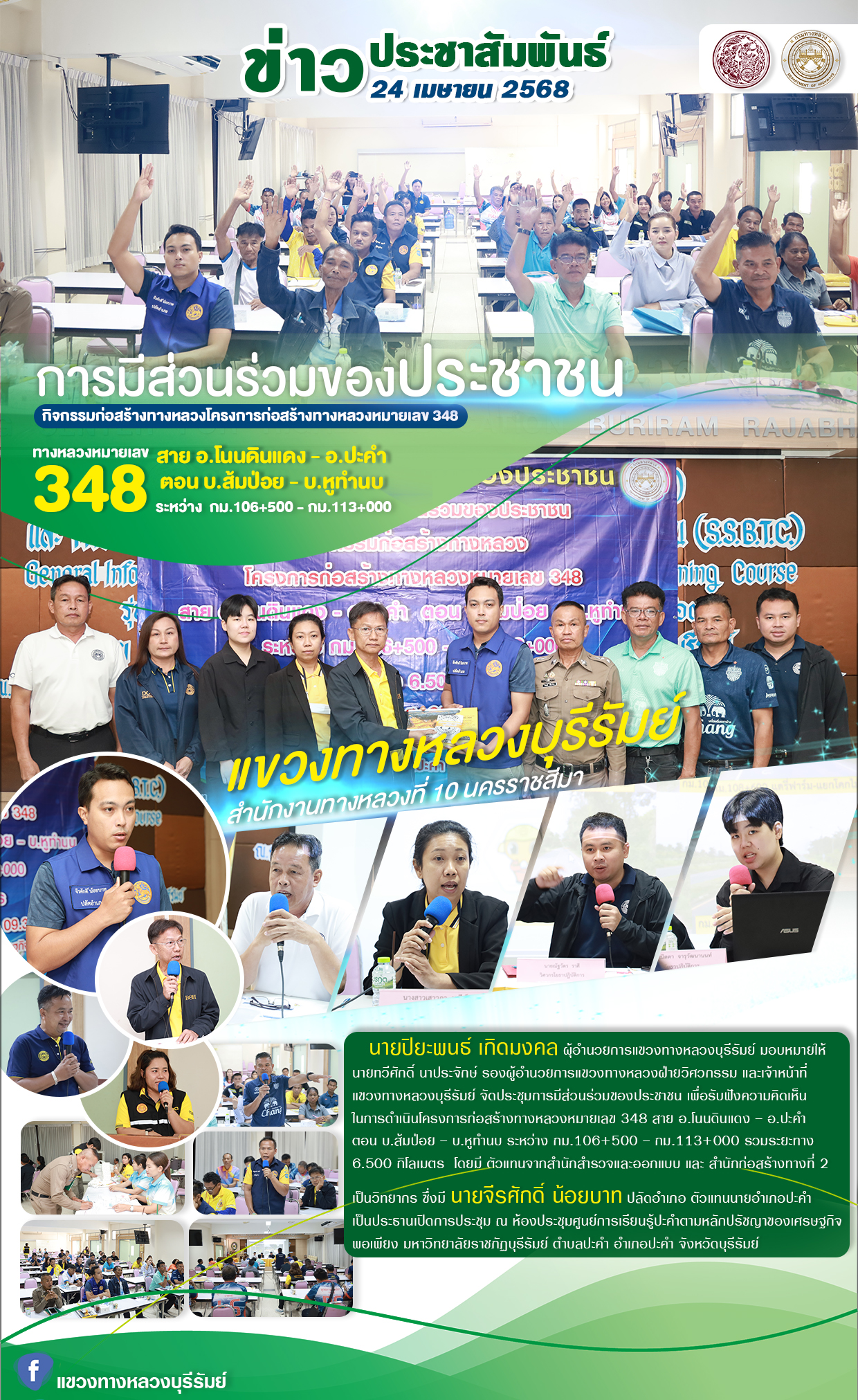 การประชุมการมีส่วนร่วมของประชาชน โครงการก่อสร้างโครงข่ายทางหลวงแผ่นดิน ทางหลวงหมายเลข 2445 สาย บุรีรัมย์ - นิคมบ้านกรวด ตอน บุรีรัมย์ - แสลงโทน ระหว่าง กม.10+750 - 17+400 และ ดม.19+385 - 24+000 รวมระยะทาง 11.268 กิโลเมตร