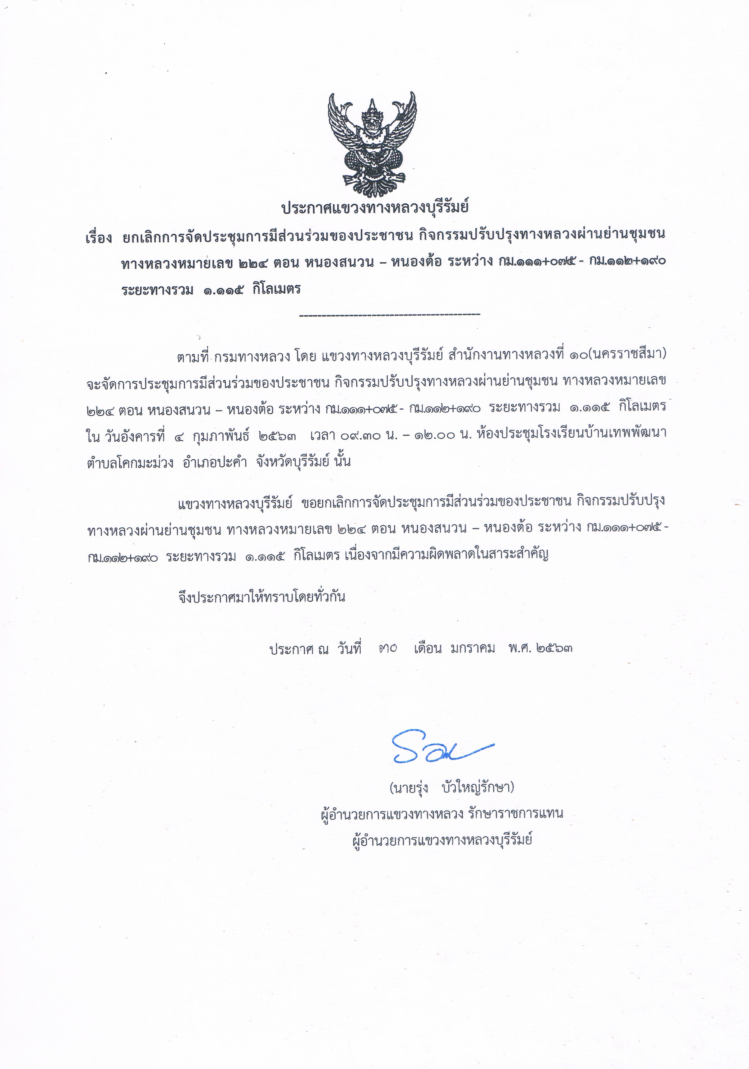 ยกเลิกการประชุมการมีส่วนร่วมของประชาชน กิจกรรมปรับปรุงทางหลวงผ่านย่านชุมชน ทางหลวงหมายเลข 224 ตอน หนองสนวน - หนองต้อ