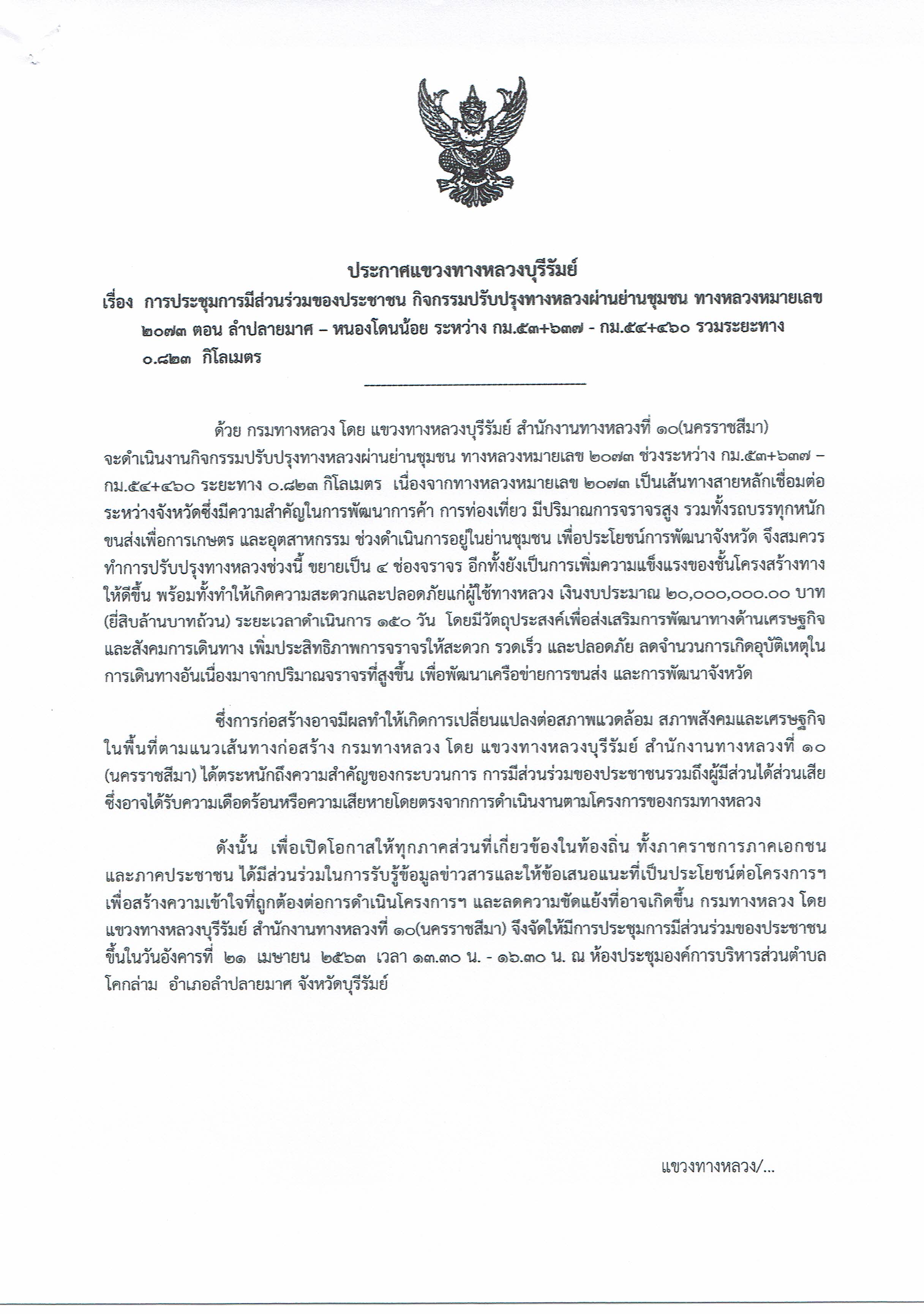 ข้อมูลข่าว : การประชุมการมีส่วนร่วมของประชาชน กิจกรรมปรับปรุงทางหลวงผ่านย่านชุมชน ทางหลวงหมายเลข ๒๐๗๓ ตอน ลำปลายมาศ - หนองโดนน้อย ระหว่าง กม.๕๓+๖๓๗ - กม.๕๔+๔๖๐ รวมระยะทาง ๐.๘๒๓