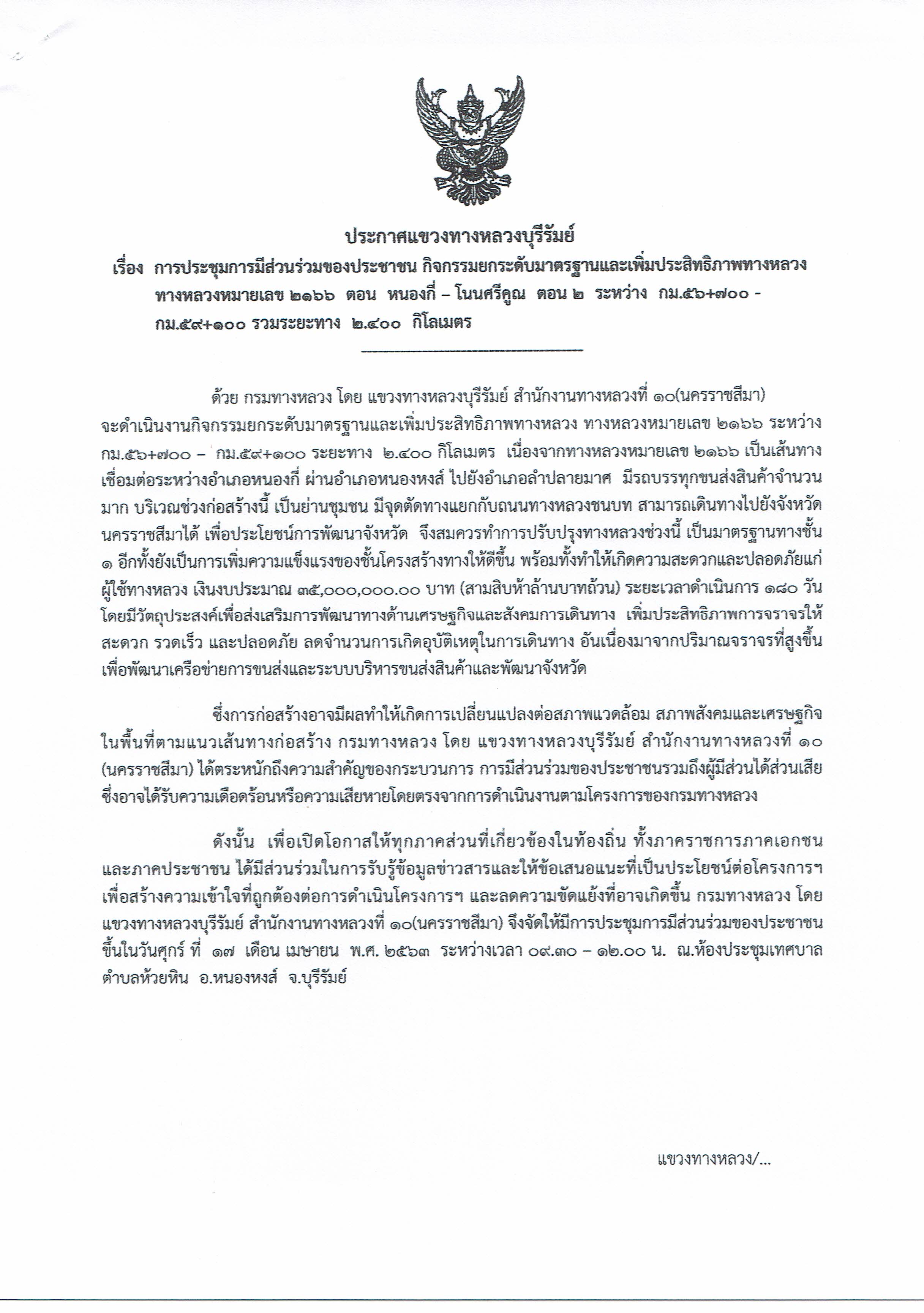 การประชุมการมีส่วนร่วมของประชาชน กิจกรรมยกระดับมาตรฐานและเพิ่มประสิทธิภาพทางหลวง ทางหลวงหมายเลข ๒๑๖๖ ตอน หนองกี่ - โนนศรีคูณ ตอน ๒ ระหว่าง กม.๕๖+๗๐๐ - กม.๕๙+๑๐๐ รวมระยะทาง ๒.๔๐๐ กิโลเมตร