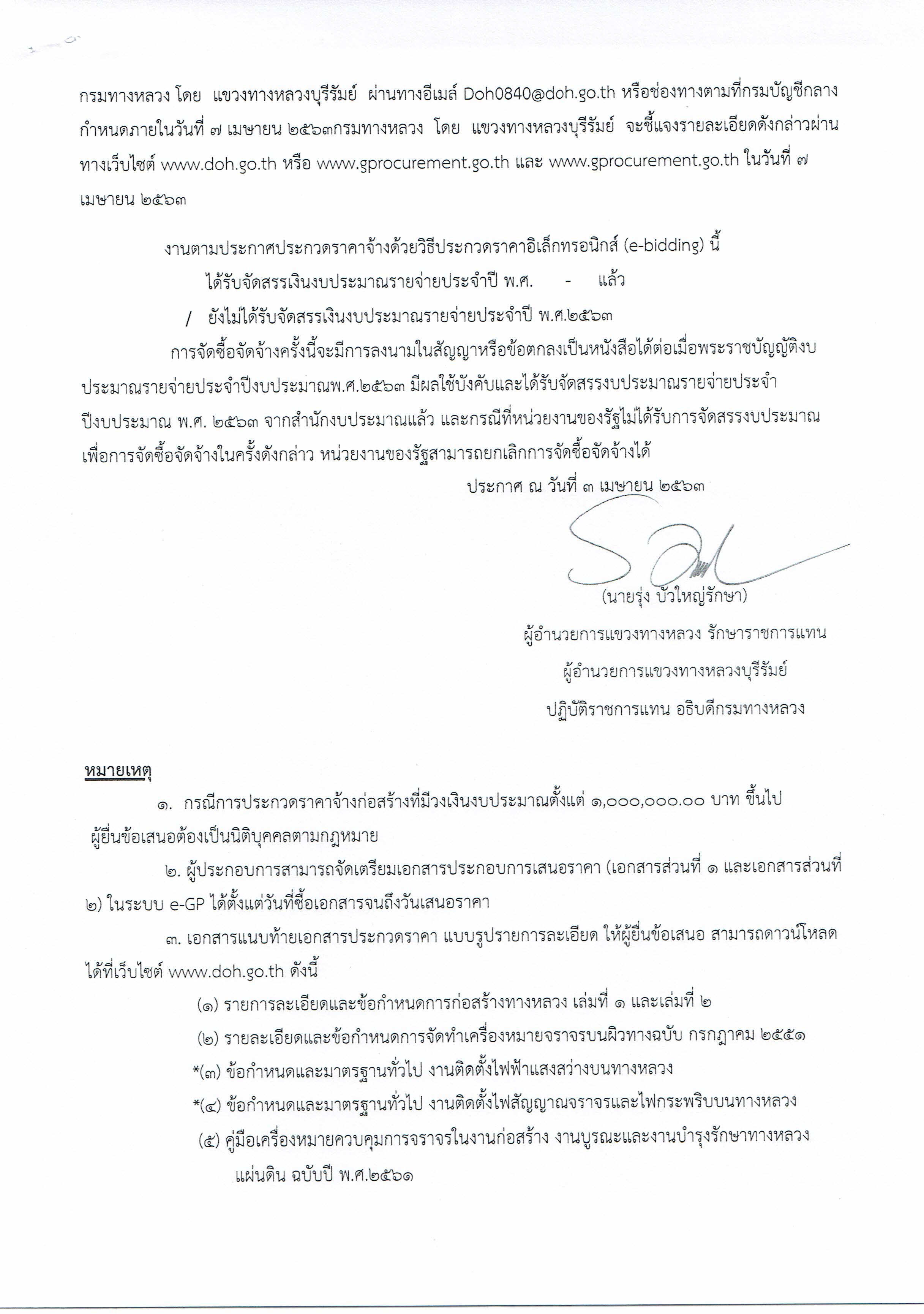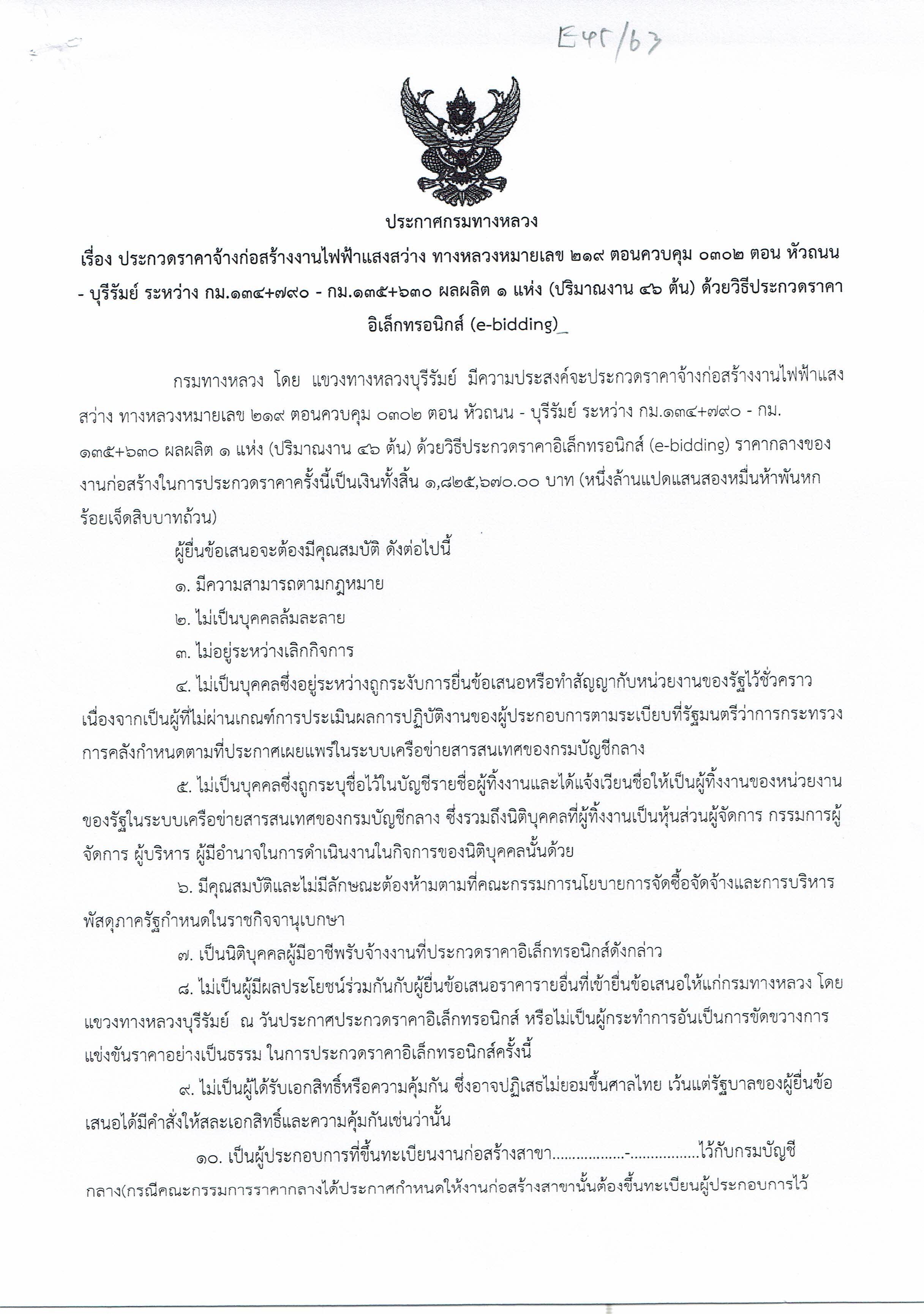 ประกวดราคาจ้างก่อสร้างงานไฟฟ้าแสงสว่าง ทางหลวงหมายเลข ๒๑๙ ตอนควบคุม ๐๓๐๒ ตอน หัวถนน-บุรีรัมย์ ระหว่าง กม.๑๓๔+๗๙๐ - กม.๑๓๕+๖๓๐ ผลผลิต ๑ แห่ง (ปริมาณงาน ๔๖ ต้น) ด้วยวิธีประกวดราคา อิเล็กทรอนิกส์ (e-bidding)