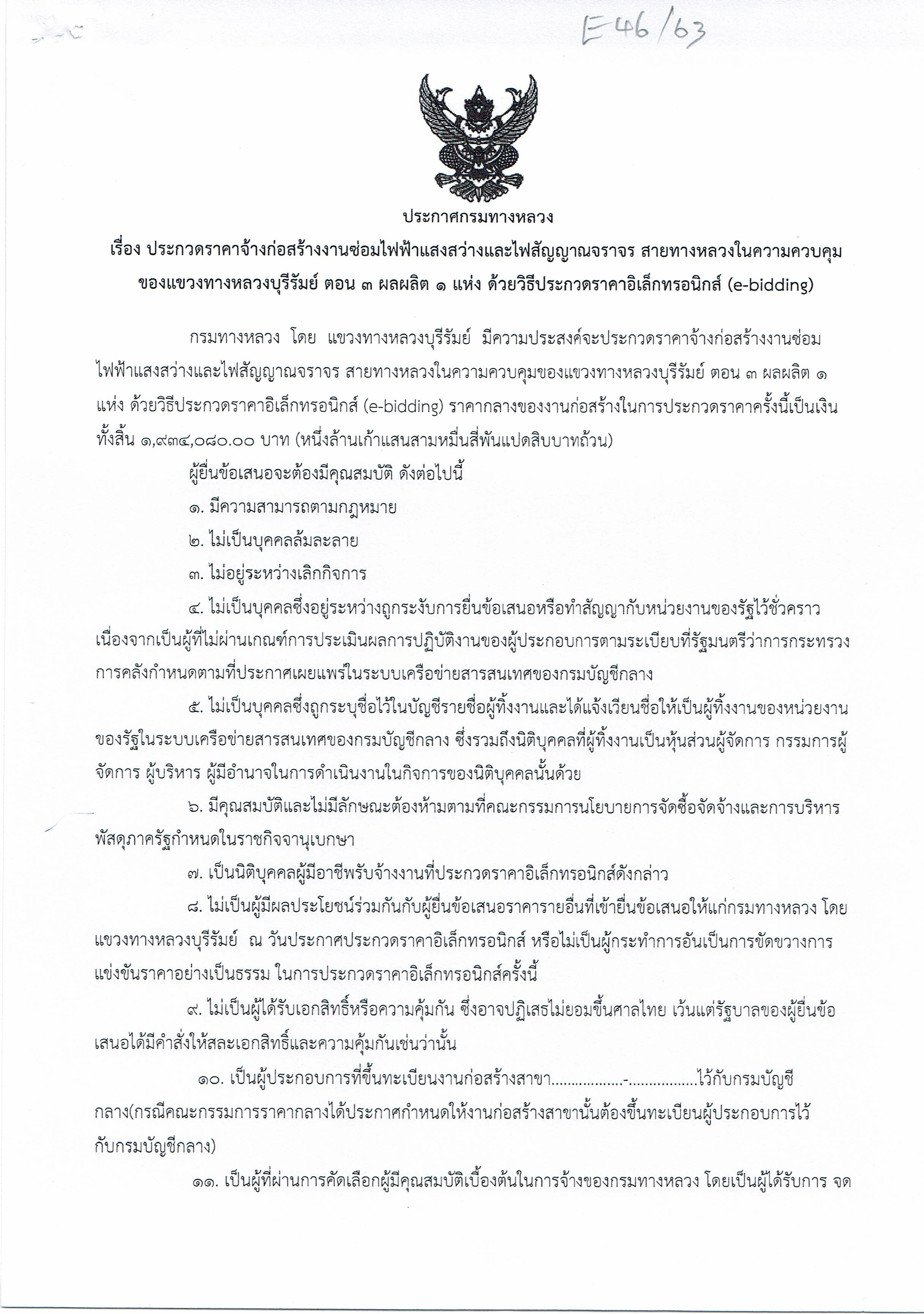 ประกวดราคาจ้างก่อสร้างงานซ่อมไฟฟ้าแสงสว่างและไฟสัญญาณจราจร สายทางหลวงในความควบคุมของแขวงทางหลวงบุรีรัมย์ ตอน ๓ ผลผลิต ๑ แห่ง ด้วยวิธีประกวดราคาอิเล็กทรอนิกส์ (e-bidding)