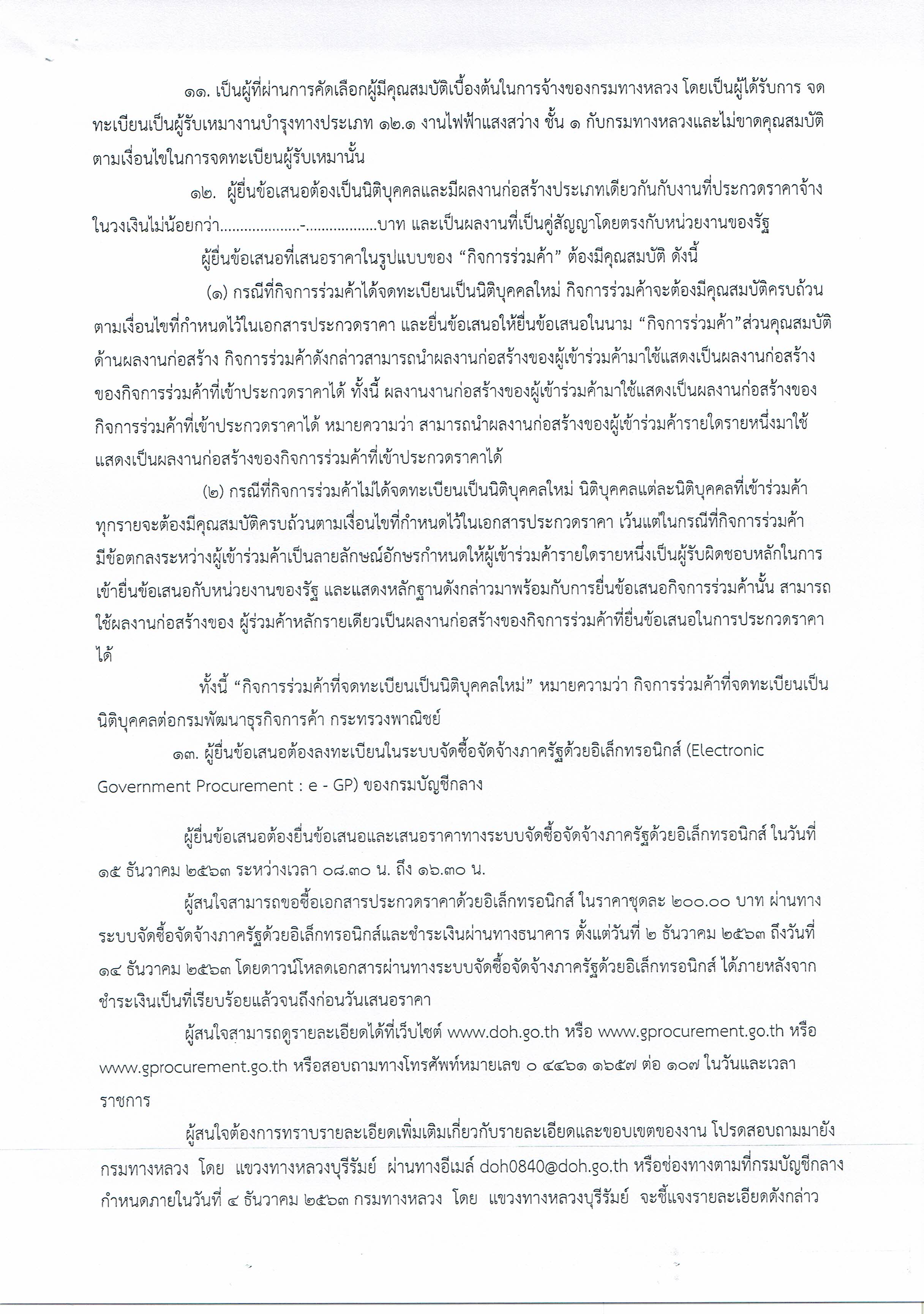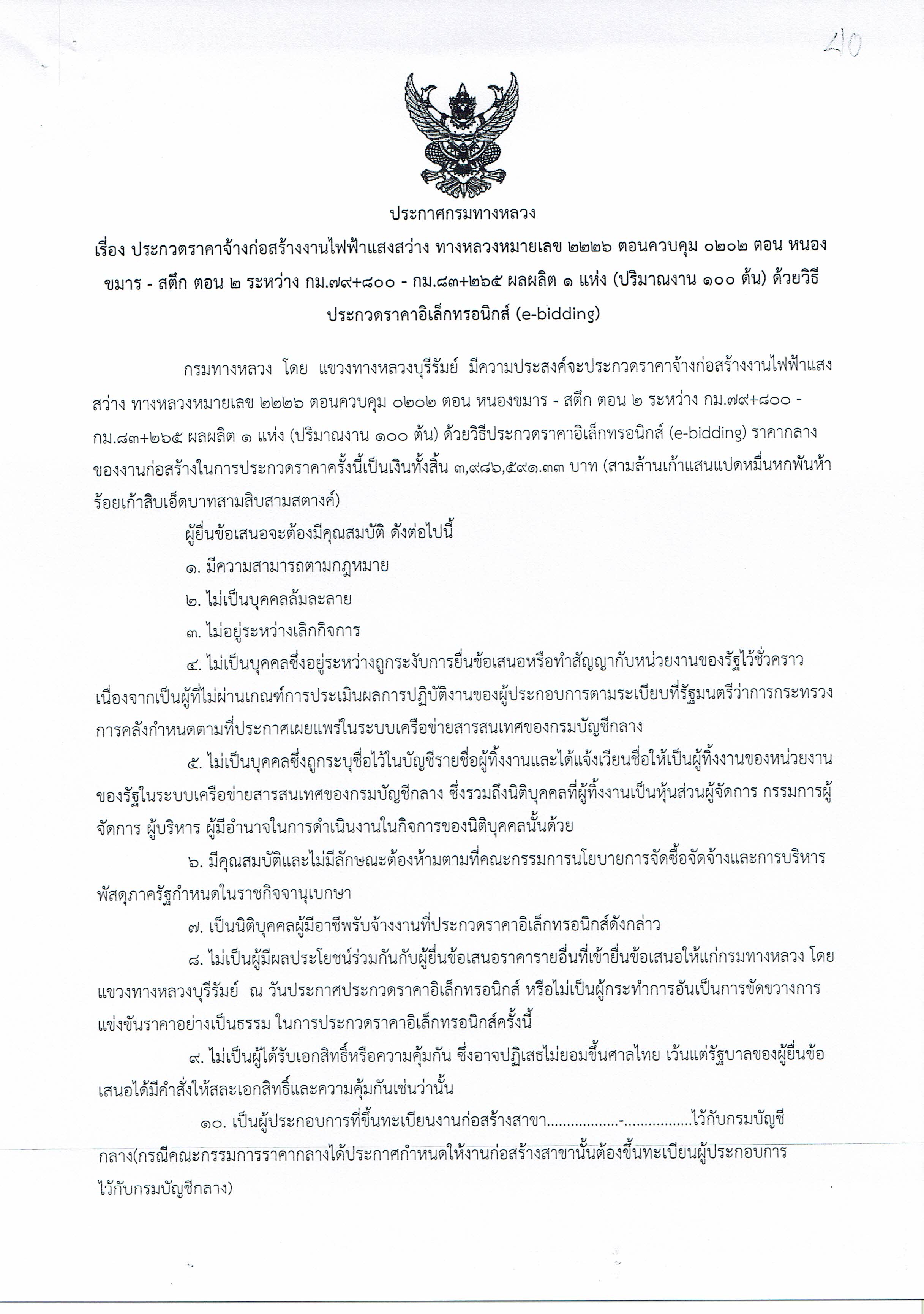 ประกวดราคาจ้างก่อสร้างงานไฟฟ้าแสงสว่าง ทางหลวงหมายเลข 2226 ตอนควบคุม 0202 ตอน หนองขมาร - สตึก ตอน 2 ระหว่าง กม.79+800 - กม.83+265 ผลผลิต 1 แห่ง (ปริมาณงาน 100 ต้น) ด้วยวิธีประกวดราคาอิเล็กทรอนิกส์ (e-bdidding)