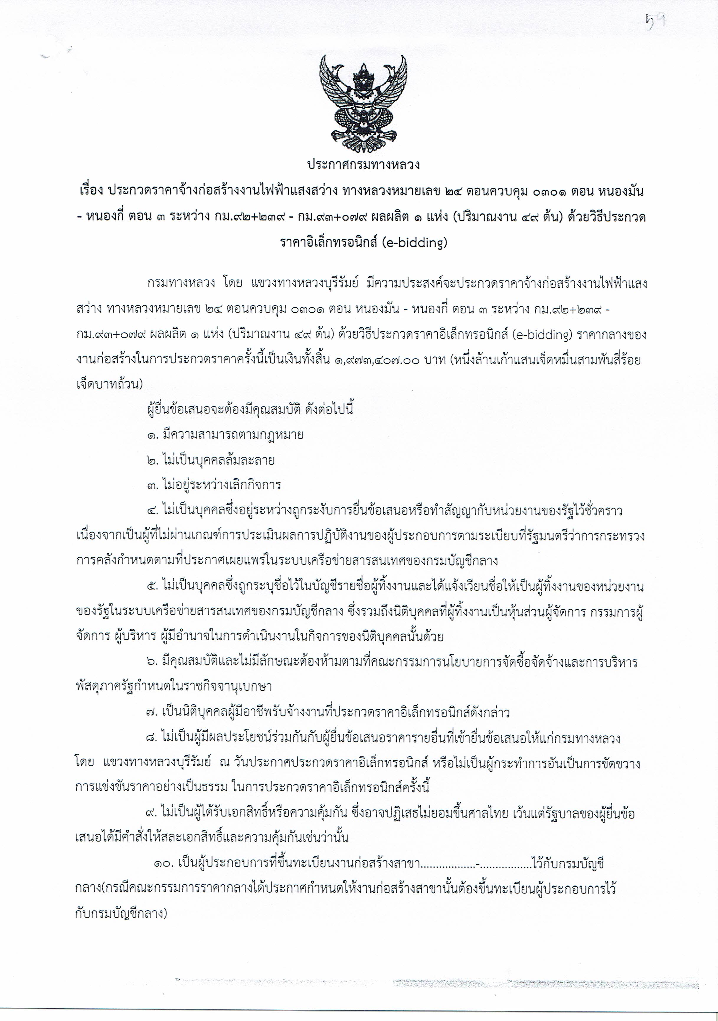 ประกวดราคาจ้างก่อสร้างงานไฟฟ้าแสงสว่าง ทางหลวงหมายเลข 24 ตอนควบคุม 0301 ตอน หนองมัน - หนองกี่ ตอน 3 ระหว่าง กม.92+239 - กม.93+079 ผลผลิต 1 แห่ง (ปริมาณงาน 49 ต้น) ด้วยวิธีประกวดราคาอิเล็กทรอนิกส์ (e-bdidding)