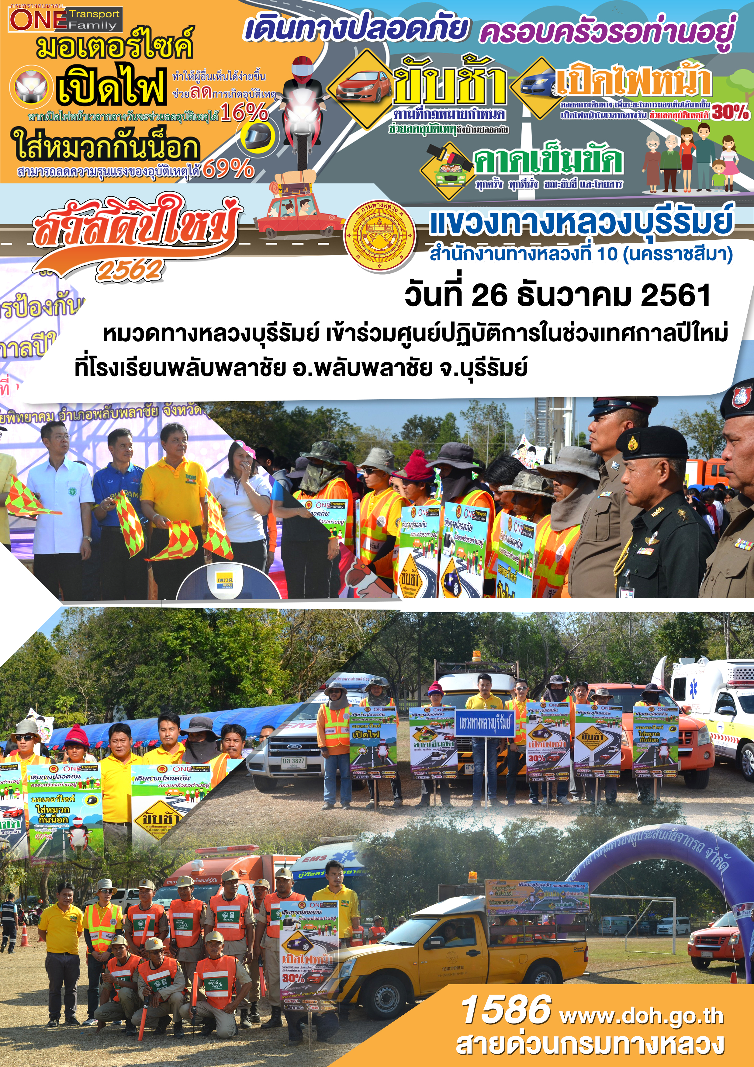เมื่อวันที่ 27 ธันวาคม 2561 ผอ.ขท.บุรีรัมย์ และเจ้าหน้าที่แขวงฯ ร่วมพิธีเปิดศูนย์ปฏิบัติการร่วมป้องกันและลดอุบัติเหตุ ทางถนน ช่วงเทศกาลปีใหม่ 2562 และปล่อยขบวนรถโครงการ “เดินทางอุ่นใจ ปลอดภัยไปกับกรมทางหลวง” เพื่ออำนวยความสะดวกและปลอดภัยให้แก่ประชาชนในช่วงเทศกาลปีใหม่นี้ ภายใต้หัวข้อการรณรงค์ เดินทางปลอดภัยครอบครัวรอท่านอยู่ “ขับช้า เปิดไฟหน้า คาดเข็มขัด” และ “มอเตอร์ไซด์เปิดไฟ ใส่หมวกกันน็อค” โดย พลตรีรณกร ปานกุล ผู้บัญชาการมณฑลทหารบกที่ 26 และเจ้าหน้าที่ทหารในสังกัดฯ เข้าร่วมในพิธี ณ บริเวณหน้าแขวงทางหลวงบุรีรัมย์