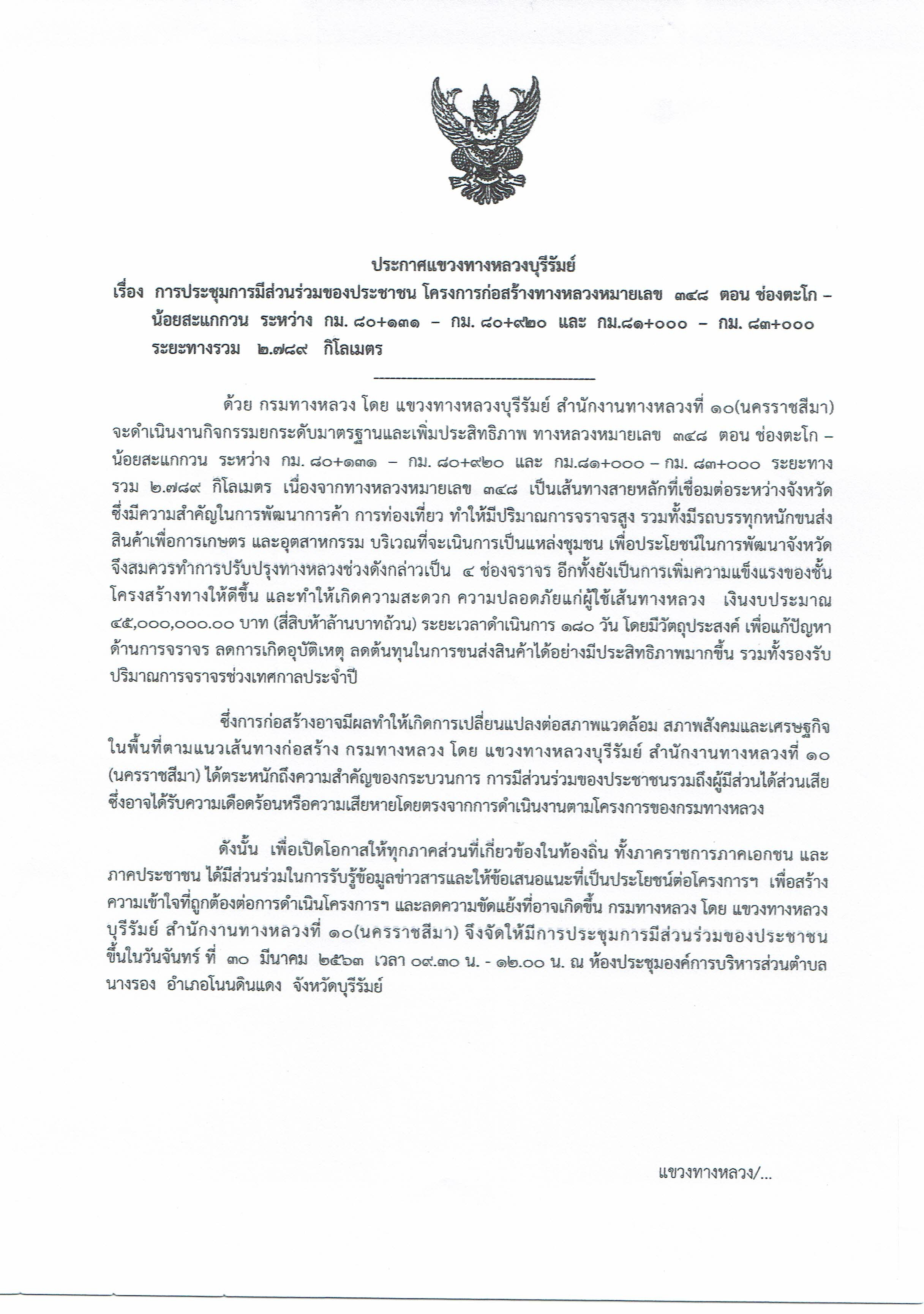 ข้อมูลข่าว : การประชุมการมีส่วนร่วมของประชาชน โครงการก่อสร้างทางหลวงหมายเลข ๓๔๘ ตอน ช่องตะโก-น้อยสะแกกวน ระหว่าง กม. ๘๐+๑๓๑ - กม.๘๐+๙๒๐ และ กม.๘๑+๐๐๐ - กม.๘๓+๐๐๐ ระยะทางรวม ๒.๗๘๙ กิโลเมตร