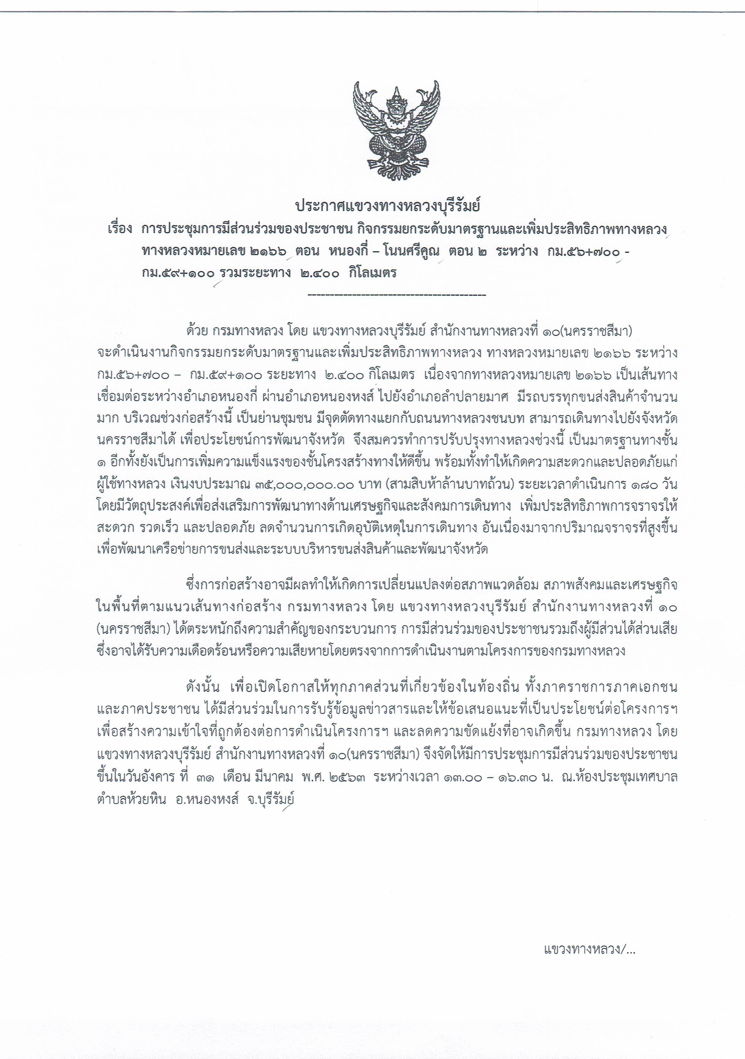 การประชุมการมีส่วนร่วมของประชาชน กิจกรรมยกระดับมาตรฐานและเพิ่มประสิทธิภาพทางหลวง ทางหลวงหมายเลข ๒๑๖๖ ตอน หนองกี่ - โนนศรีคูณ ตอน ๒ ระหว่าง กม.๕๖+๗๐๐ - กม.๕๙+๑๐๐ รวมระยะทาง ๒.๔๐๐ กิโลเมตร