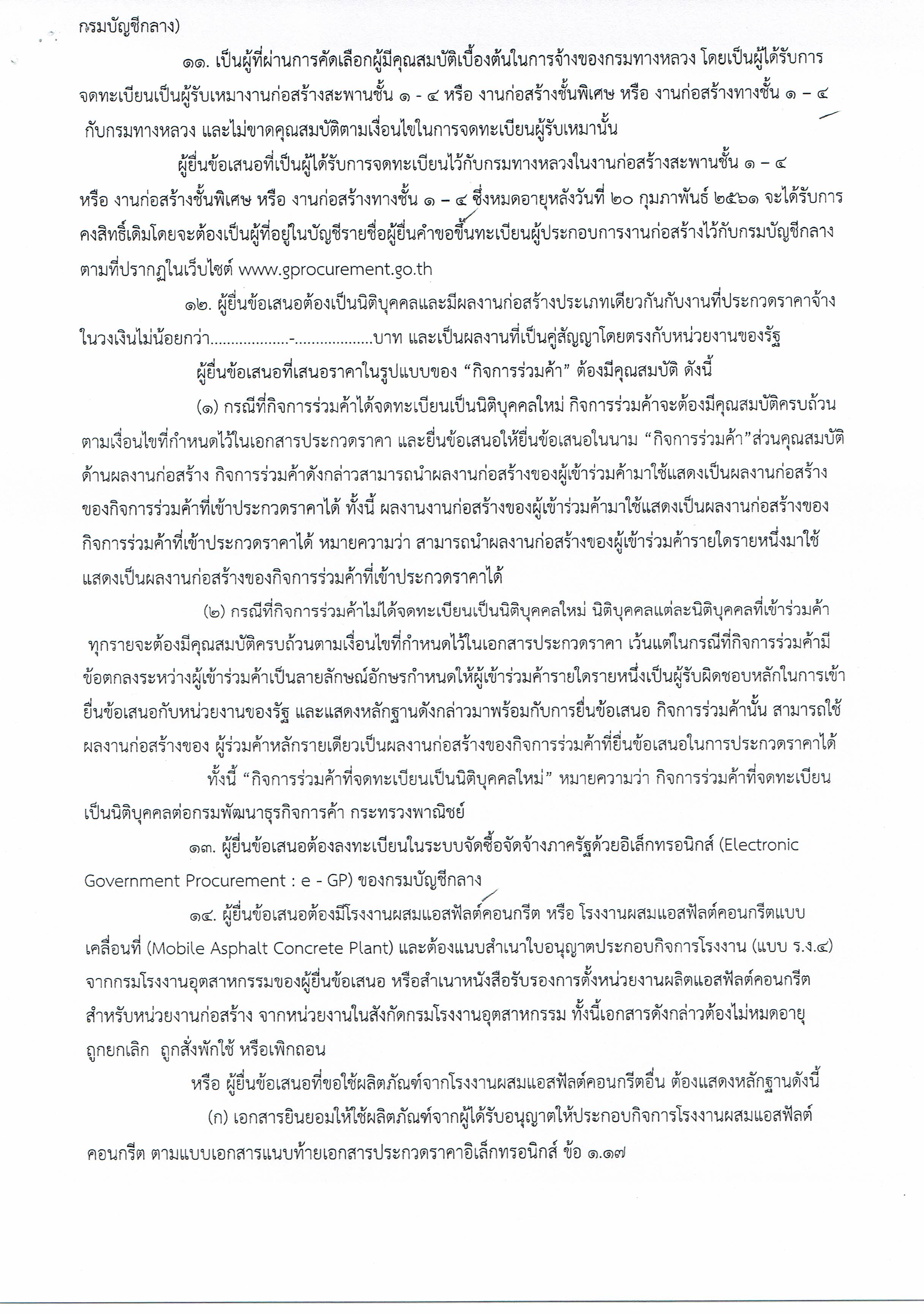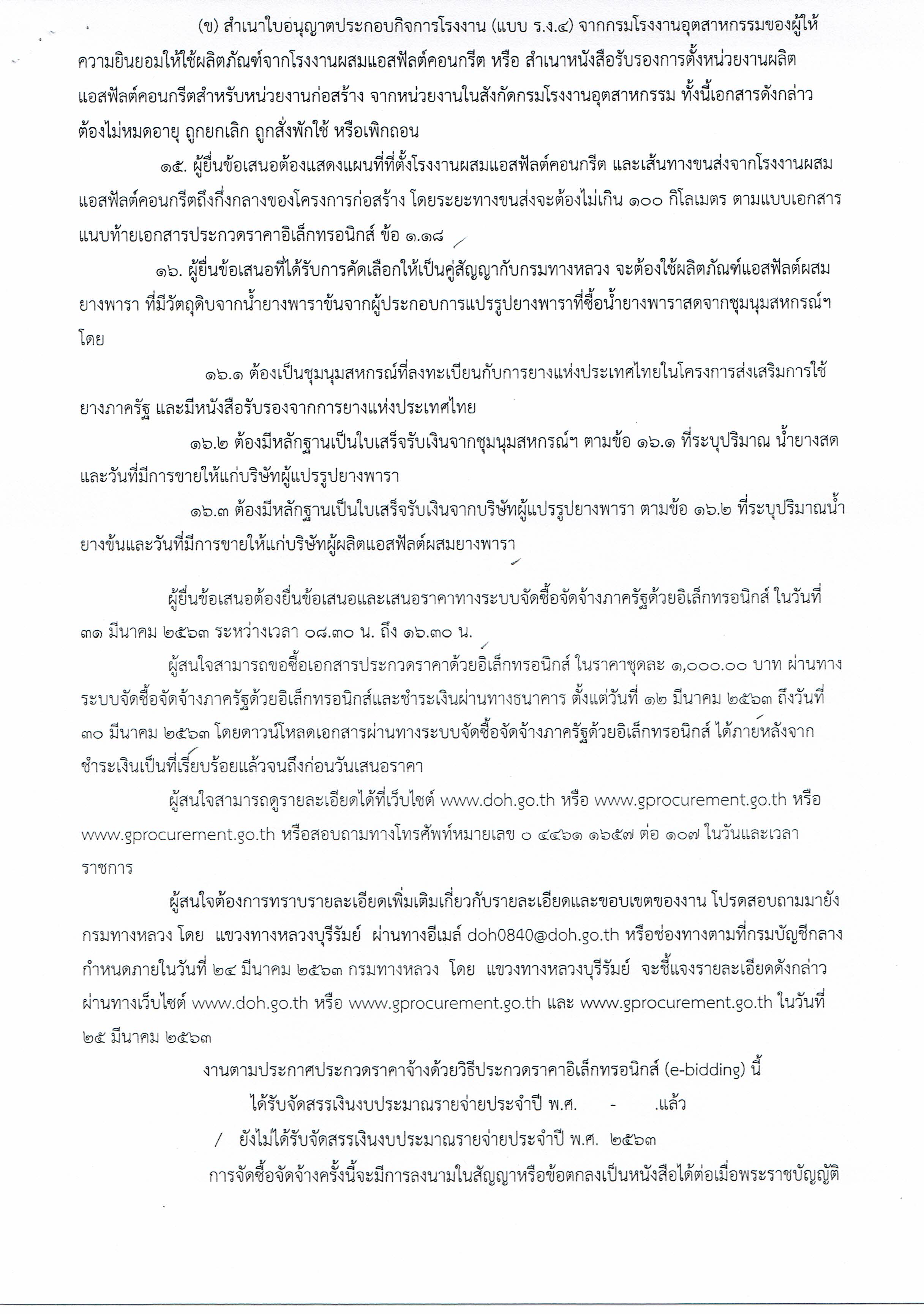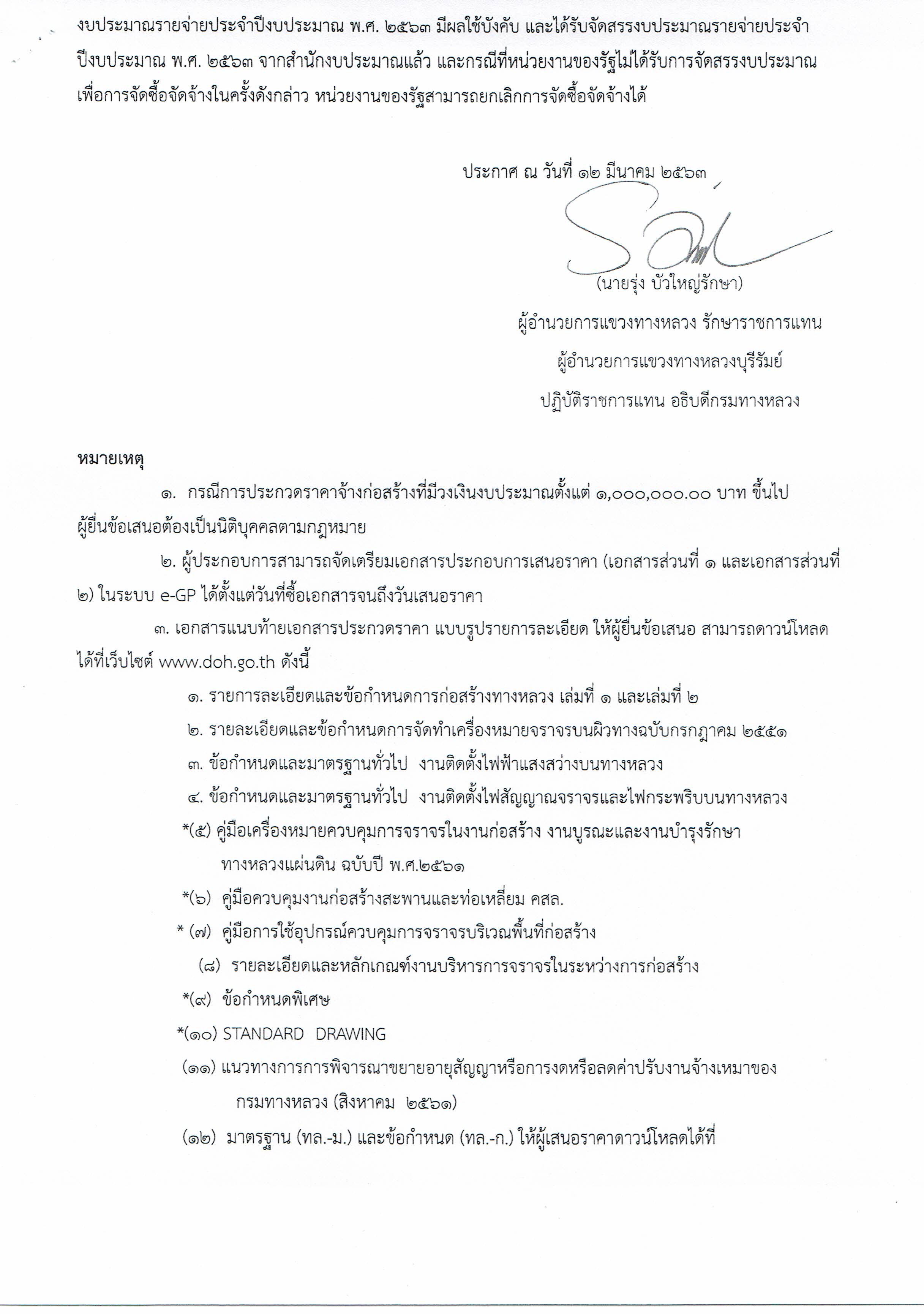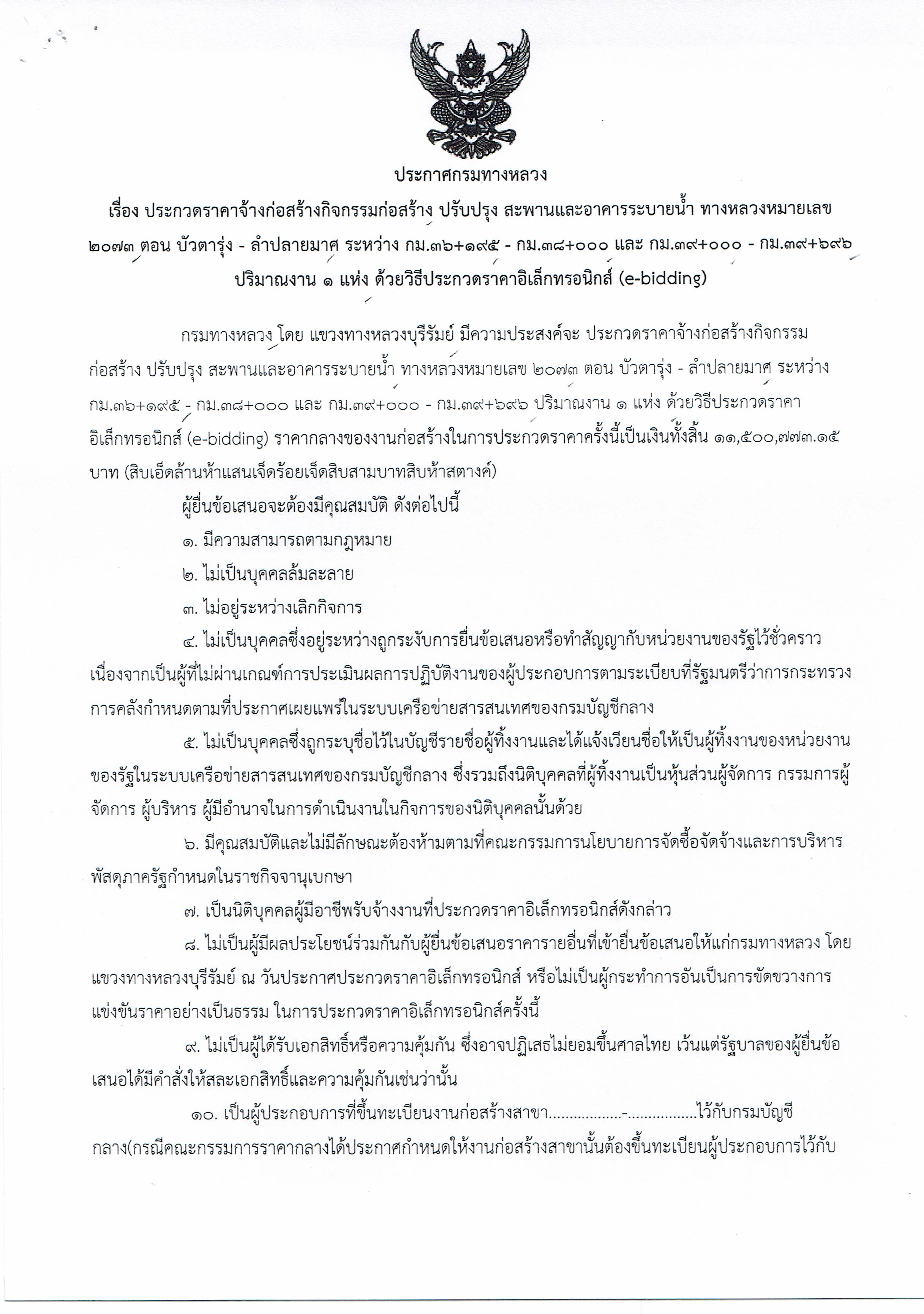ประกวดราคาจ้างก่อสร้างกิจกรรมก่อสร้าง ปรับปรุง สะพานและอาคารระบายน้ำ ทางหลวงหมายเลข ๒๐๗๒ ตอน บัวตารุ่ง - ลำปลายมาศ ระหว่าง กม.๓๖+๑๙๕ - กม.๓๘ และ กม.๓๙+๐๐ - กม.๓๙+๖๙๖ ปริมาณงาน ๑ แห่ง ด้วยวิธีประกวดราคาอิเล็กทรอนิกส์ (e-bidding)