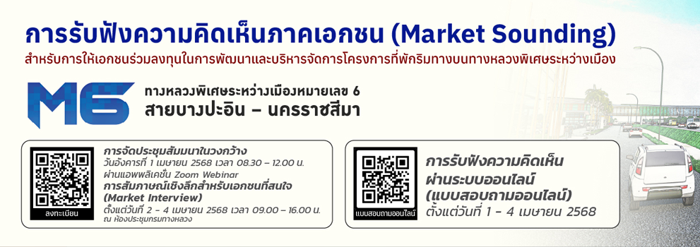กรมทางหลวงเปิดรับฟังความคิดเห็นภาคเอกชน (Market Sounding) สำหรับการให้เอกชนร่วมลงทุนในการพัฒนาและบริหารจัดการโครงการที่พักริมทางบนทางหลวงพิเศษระหว่างเมืองหมายเลข 6 สายบางปะอิน-นครราชสีมา