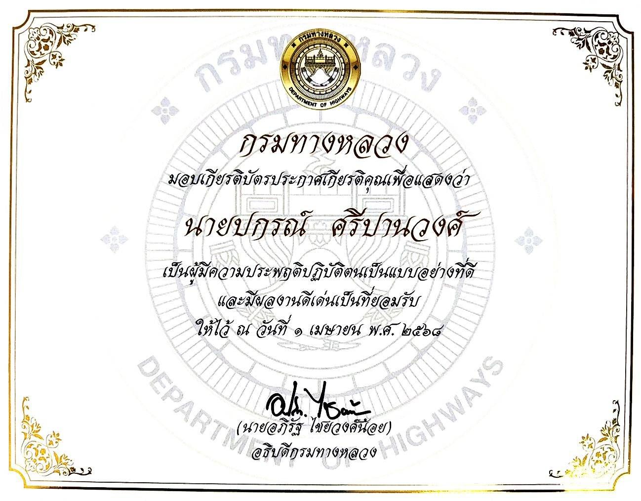 ผส.ทล.๑๐ ได้รับเกียรติบัตรประกาศเกียรติคุณ