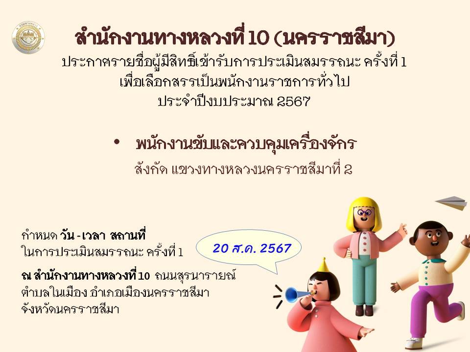 สำนักงานทางหลวงที่ 10 (นครราชสีมา) ประกาศรายชื่อผู้มีสิทธิเข้ารับการประเมินความรู้ ความสามารถ ทักษะ สมรรถนะครั้งที่ 1 พร้อมกำหนด วันเวลา สถานที่ประเมิน และระเบียบปฏิบัติเกี่ยวกับการประเมิน ในตำแหน่ง