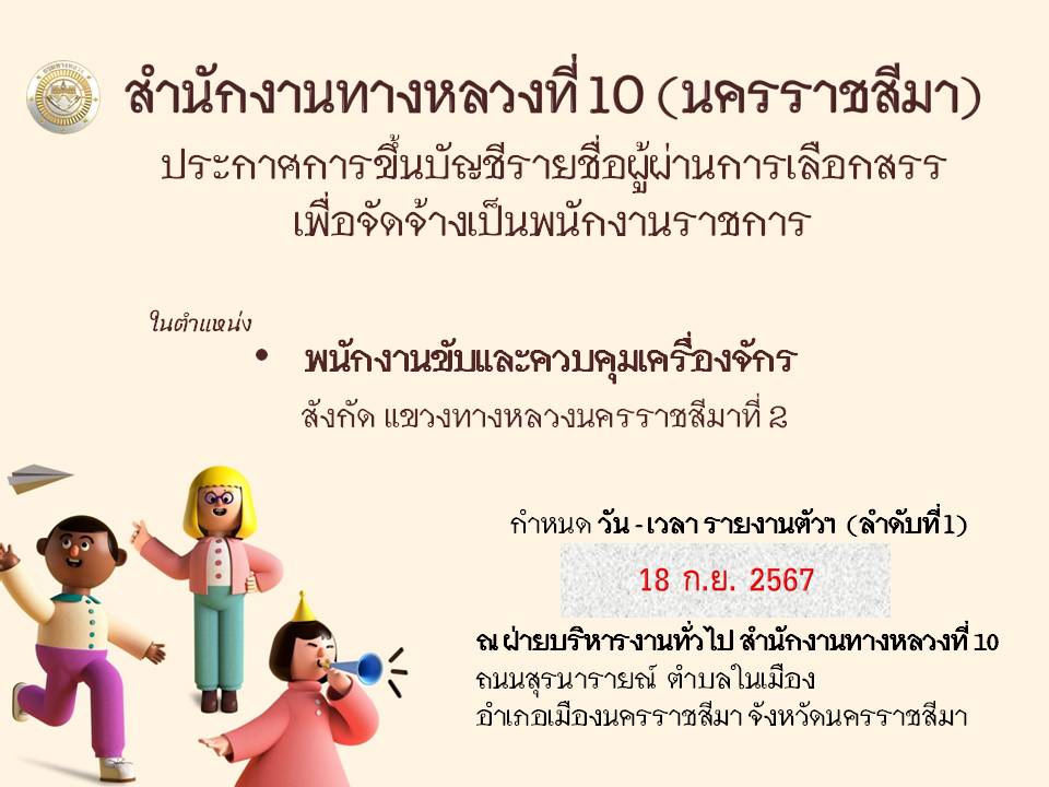 สำนักงานทางหลวงที่ 10 (นครราชสีมา) ประกาศรายชื่อผู้ผ่านการเลือกสรรเพื่อจัดจ้างเป็นพนักงานราชการ ในตำแหน่ง