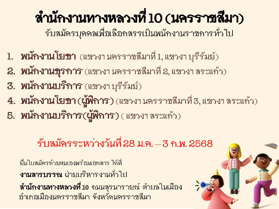 สำนักงานทางหลวงที่ 10 (นครราชสีมา) รับสมัครบุคคลเพื่อสรรหาและเลือกสรรเป็นพนักงานราชการทั่วไป ในตำแหน่ง