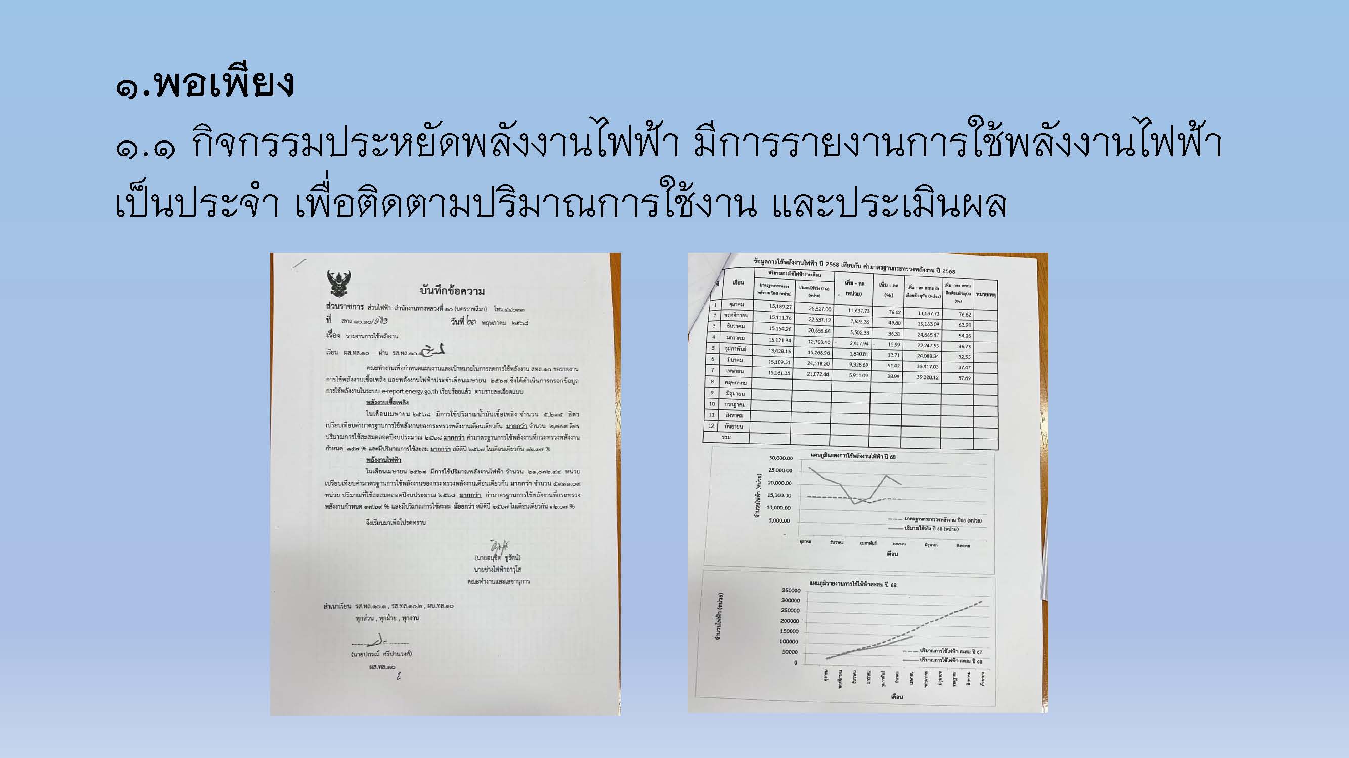 1.1 กิจกรรมประหยัดพลังงานไฟฟ้า มีการรายงานการใช้พลังงานไฟฟ้าเป็นประจำ เพื่อติดตามปริมาณการใช้งาน และประเมินผล
