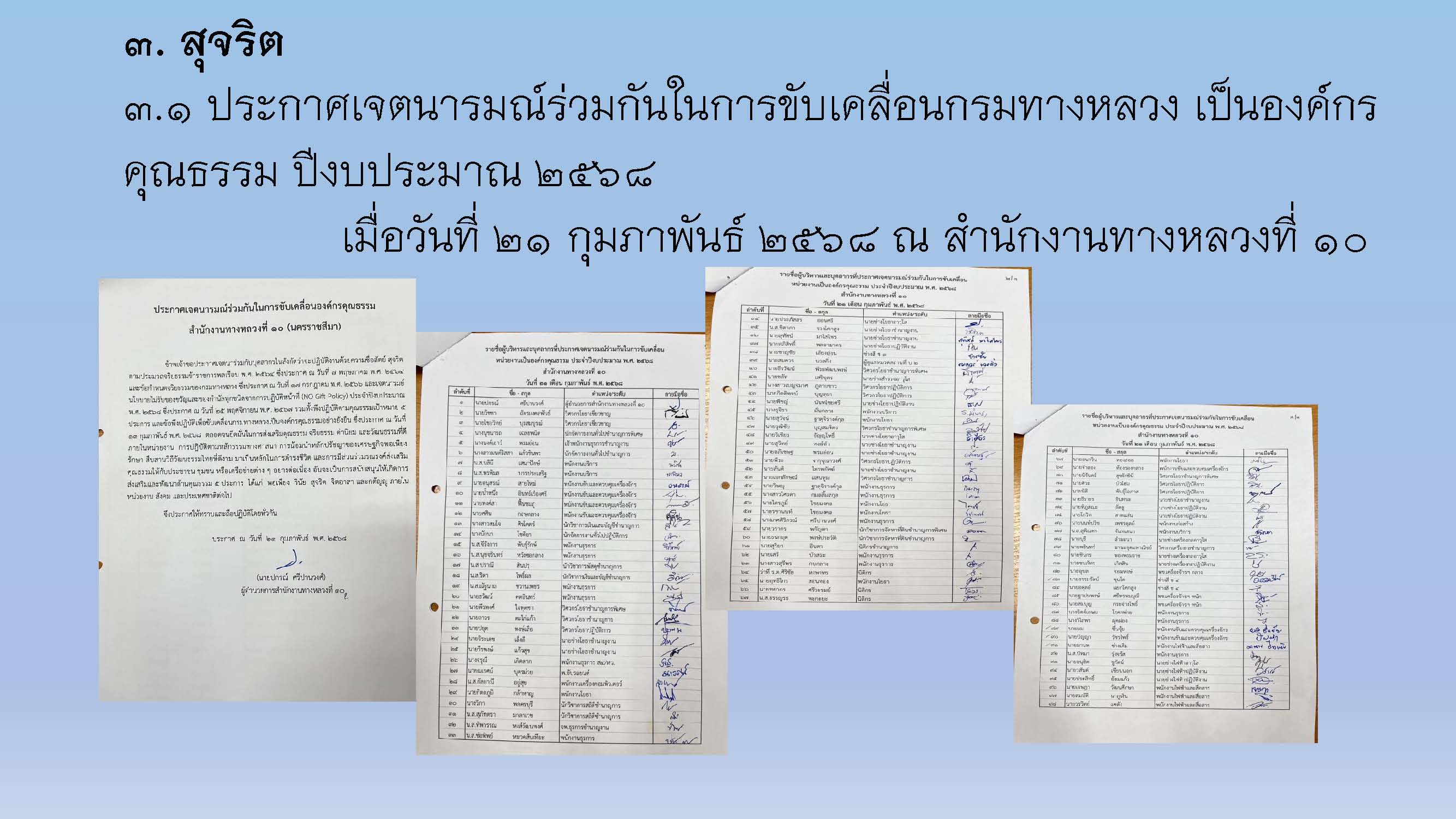 3.1 ประกาศเจตนารมณ์ร่วมกันในการขับเคลื่อนกรมทางหลวง เป็นองค์กรคุณธรรม ปีงบประมาณ 2568 เมื่อวันที่ 21 กุมภาพันธ์ 2568 ณ สำนักงานทางหลวงที่ 10
