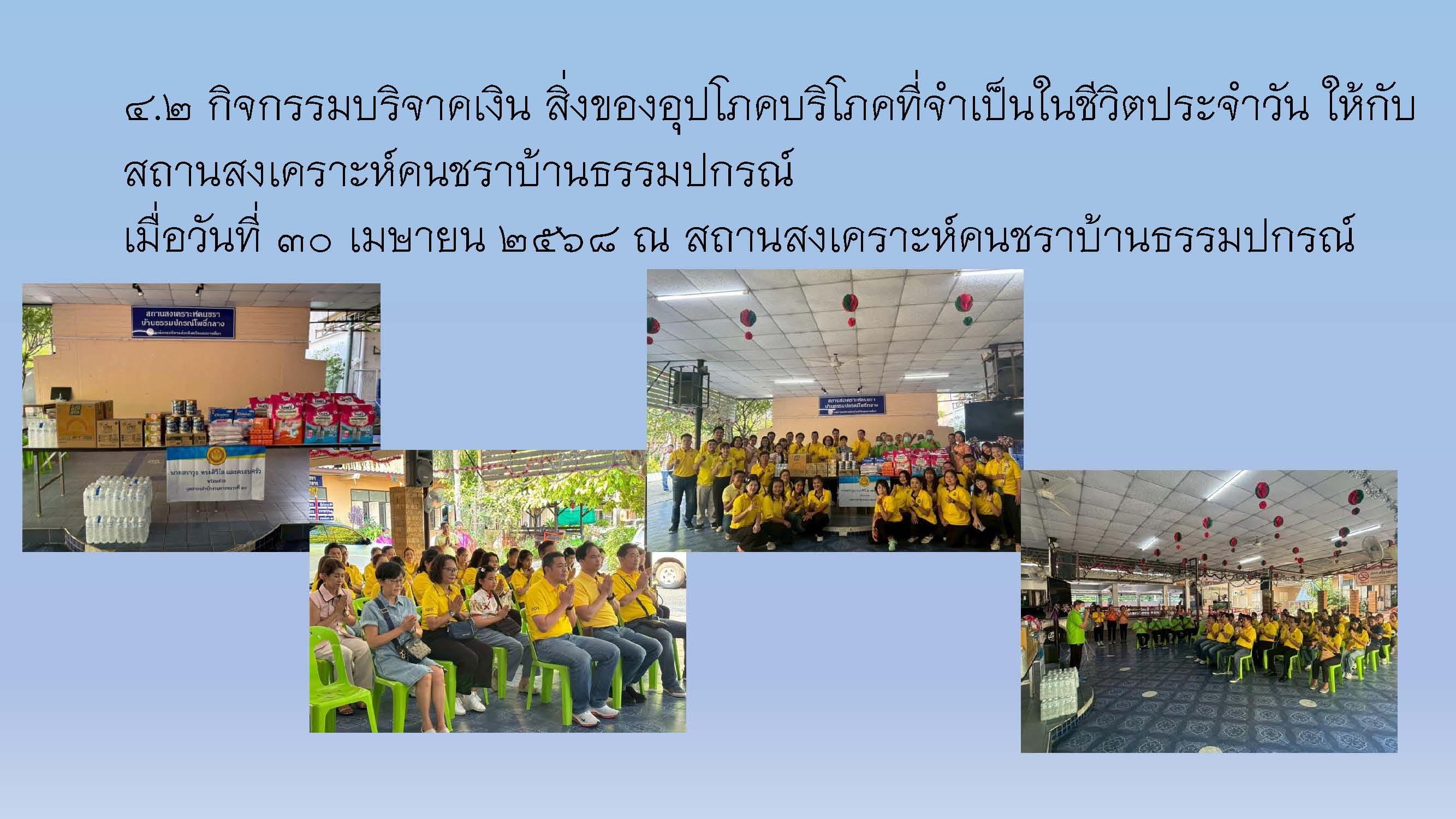 4.2 กิจกรรมบริจาคเงิน สิ่งของอุปโภคบริโภคที่จำเป็นในชีวิตประจำวัน ให้กับสถานสงเคราะห์คนชราบ้านธรรมปกรณ์ เมื่อวันที่ 30 เมษายน 2568 ณ สถานสงเคราะห์คนชราบ้านธรรมปกรณ์