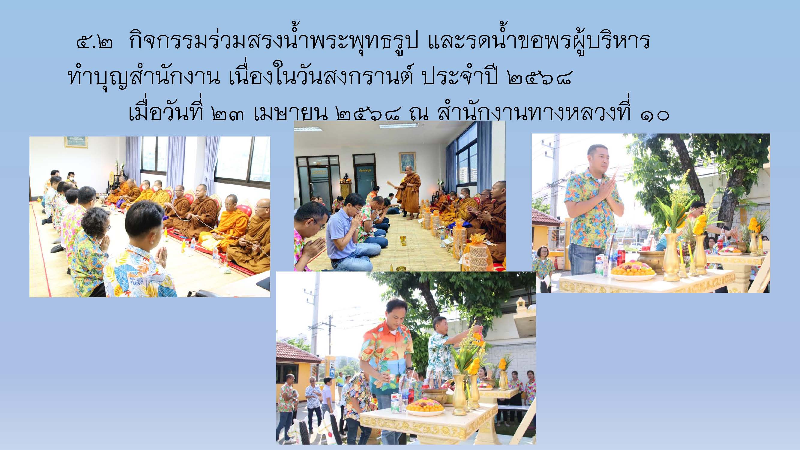 5.2 กิจกรรมร่วมสรงน้ำพระพุทธรูป และรดน้ำขอพรผู้บริหาร , ทำบุญสำนักงาน เนื่องในวันสงกรานต์ ประจำปี 2568 เมื่อวันที่ 23 เมษายน 2568 ณ สำนักงานทางหลวงที่ 10