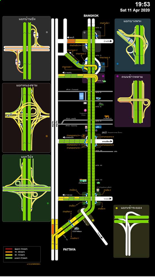 มอเตอร์เวย์ M 7 (ด่านฯ ลาดกระบัง) ปริมาณจราจร ขาออก 29,497 คัน/วัน น้อยกว่าช่วงเวลาปกติ 52% น้อยกว่าสงกรานต์ปีที่แล้ว 50% และ ทางหลวงหมายเลข 9 (บางปะอิน - บางพลี) สภาพการจราจรโดยรวม ปริมาณรถปานกลาง เคลื่อนตัวได้ดี