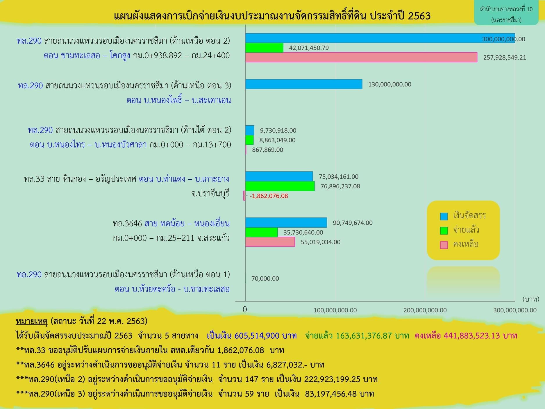 จากการประชุมประจำเดือนของสำนักงานทางหลวงที่ 10 (นครราชสีมา) ในวันที่ 26 พ.ค.2563 เวลา 09.30น. โดยมีนายจิระพงศ์ เทพพิทักษ์ ผู้อำนวยการสำนักทางหลวงที่ 10 (ผส.ทล.10) เป็นประธานที่ประชุม ร่วมด้วยผู้บริหารส่วนฯ ร่วมประชุมนั้น นายสรศักดิ์ แก้วขวัญ ผู้อำนวยการส่วนกฎหมายและกรรมสิทธิ์ที่ดิน สำนักงานทางหลวงที่ 10 (ผก.ทล.10) ได้ให้ข้อมูลประเด็นการเร่งรัดจ่ายค่าทดแทนที่ดินว่าปี 2563 สทล.10 ได้รับเงินงบประมาณจัดสรรงานจัดกรรมสิทธิ์ที่ดิน จำนวน 5 สายทาง เป็นเงิน 605,514,900 บาท จ่ายค่าเวนคืนที่ดินแล้ว 163,631,376.87 บาท คงเหลือ 441,883,523.13 บาท