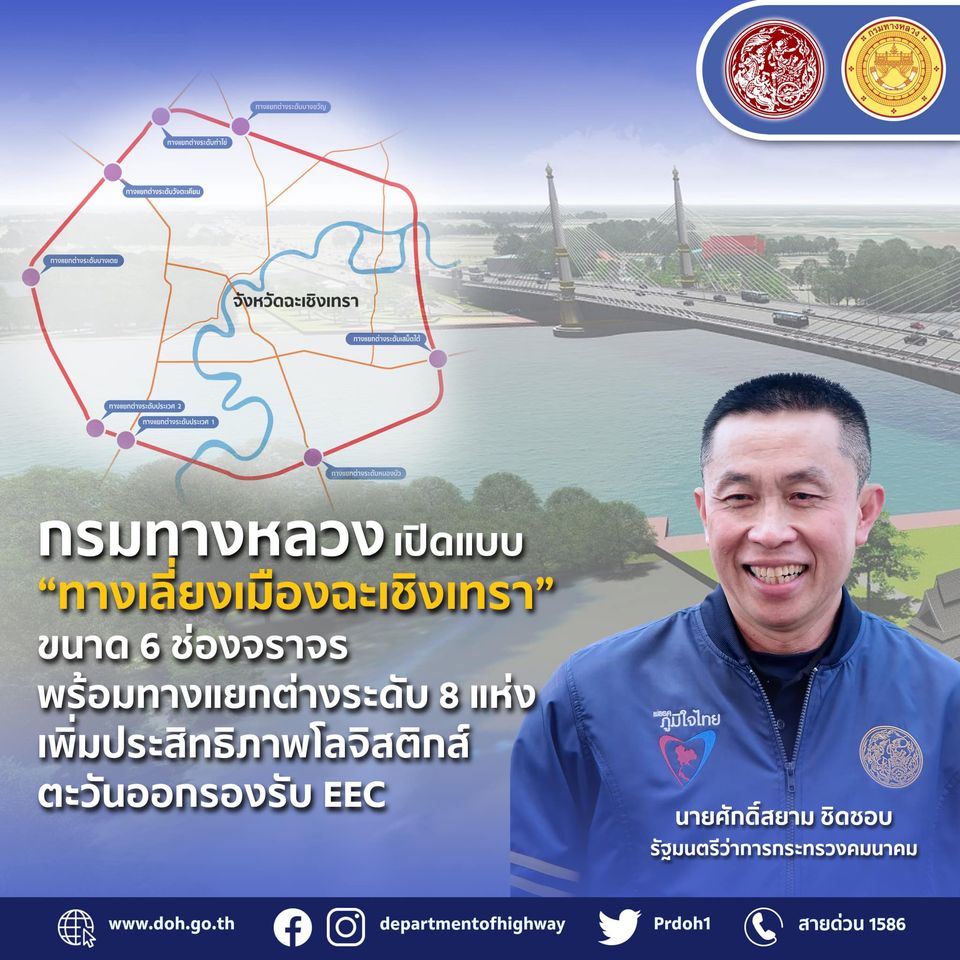 กรมทางหลวง เปิดแบบ “ทางเลี่ยงเมืองฉะเชิงเทรา” ขนาด 6 ช่องจราจรพร้อมทางแยกต่างระดับ 8 แห่ง เพิ่มประสิทธิภาพโลจิสติกส์ตะวันออกรองรับEEC