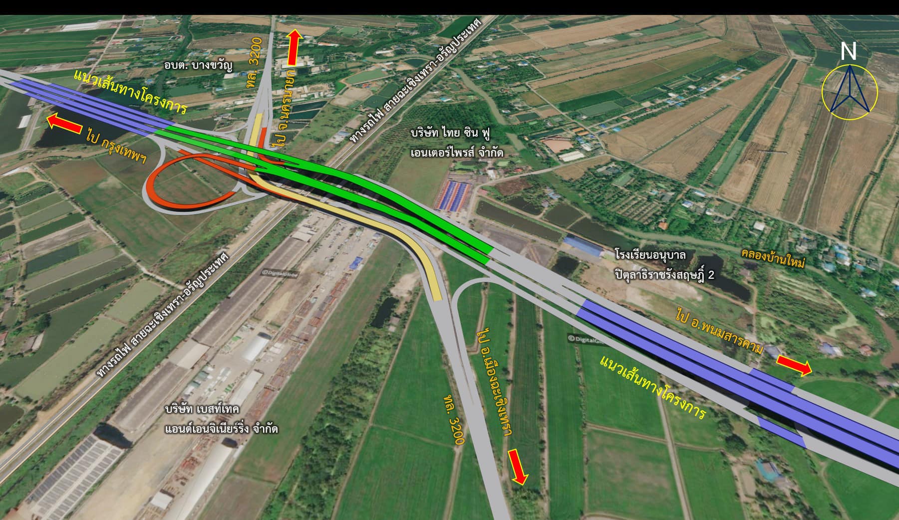 2. บริเวณจุดตัดทางหลวง หมายเลข 3200 (ทางแยกต่างระดับบางขวัญ) ออกแบบสะพานยกระดับข้ามทางหลวงหมายเลข 3200 และข้ามทางรถไฟ ขนาด 6 ช่องจราจร ทางเชื่อมแบบเลี้ยววน (Loop ramp) ขนาด 2 ช่องจราจร สะพานเชื่อมทางหลวงหมายเลข 3200 ขนาด 1 ช่องจราจร และสะพานเชื่อมแยกออกจากทางหลวงหมายเลข 3200 ขนาด 1 ช่องจราจร การจราจรพื้นราบมีจุดกลับรถใต้สะพาน