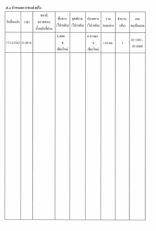 ตั้งแต่เวลา 21.00 - 04.00 น. ในวันที่ 17 ธันวาคม 2562่ - 15 มกราคม 2563 ระยะเวลารวม 30 วัน เนื่องจาก บริษัท ภาคเหนือวัสดุก่อสร้าง จำกัด จะดำเนินการขนเครื่องจักรขนาดใหญ่ สินค้า และอุปกรณ์ โดยมีจุดเริ่มต้นจากเส้น 108 อำเภอฮอด จังหวัดเชียงใหม่ ไปยัง เส้น 108 อำเภอหางดง จังหวัดเชียงใหม่ (ไป – กลับ) ตามหนังสืออนุญาต เลขที่ คค 06148/9320 ลงวันที่ 1 พฤศจิกายน 2562 หมดอายุวันที่ 10 มิถุนายน 2563 และหนังสือคำขออนุมัติใช้เส้นทาง ตามคำขอเลขที่ 1046 ลงวันที่ 16 ธันวาคม 2562 ในเส้นทางดังกล่าว