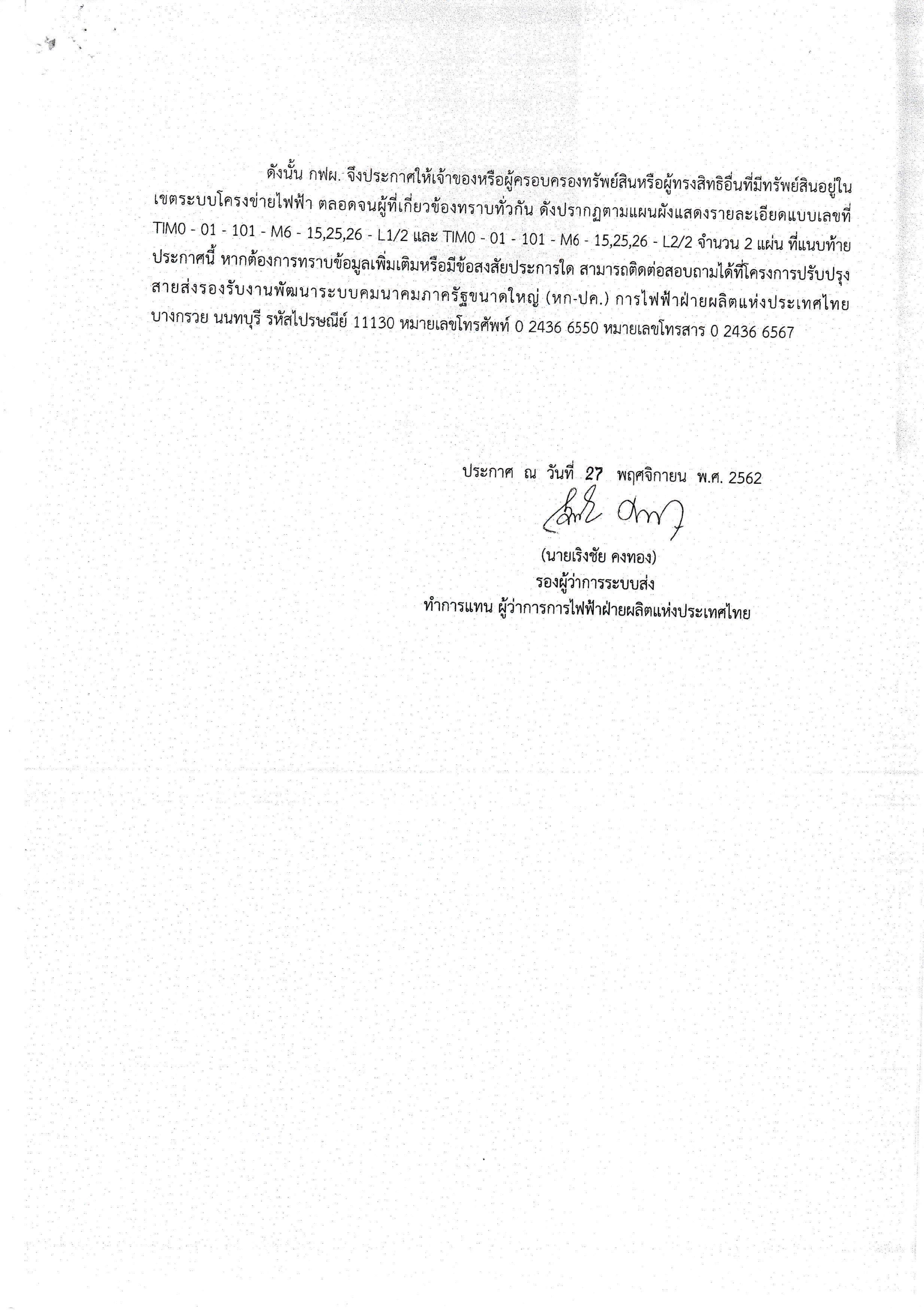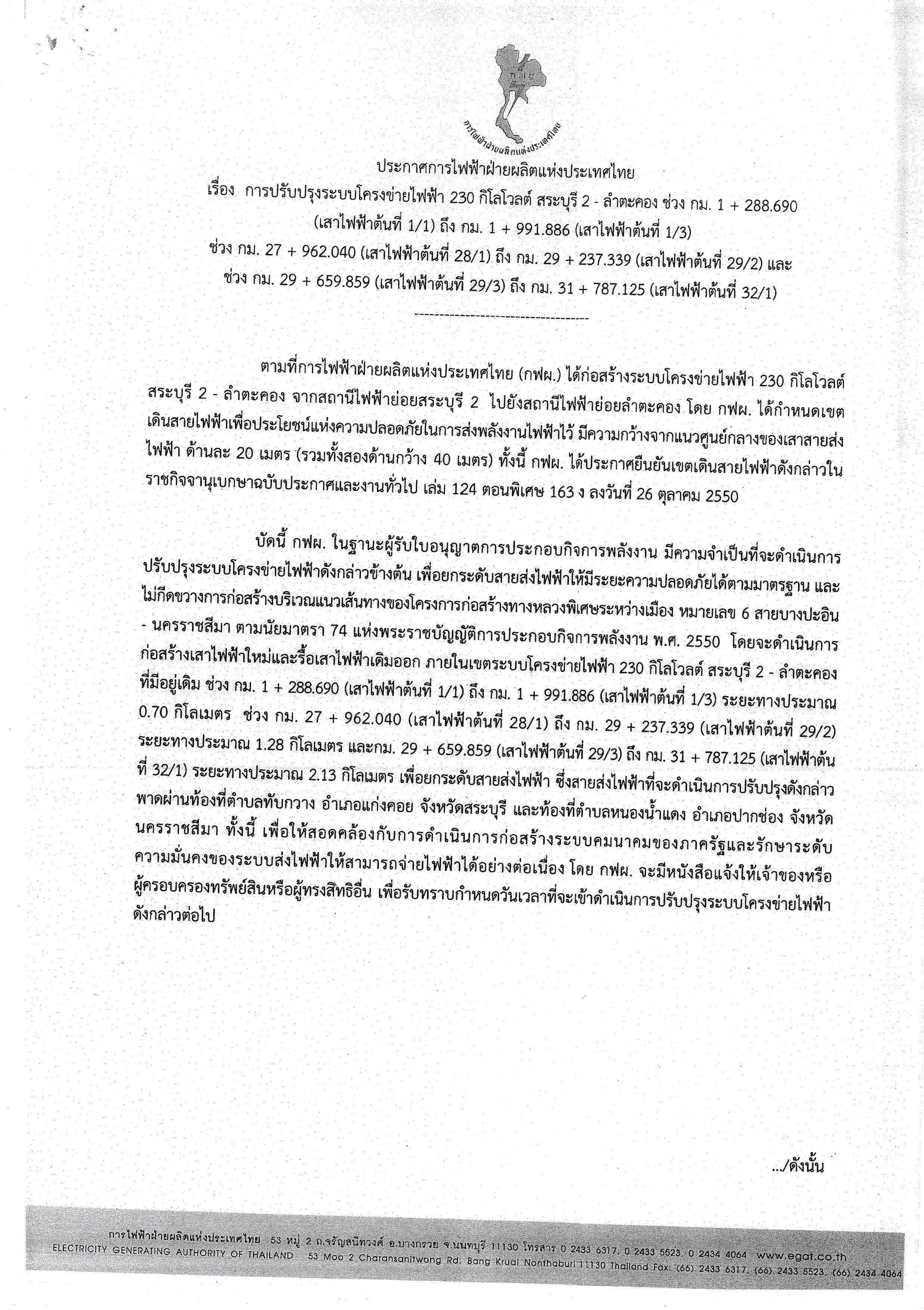 ดำเนินการปรับปรุงระบบโครงข่ายไฟฟ้า 230 กิโลโวลต์ สระบุรี2-ลำตะคลอง ช่วง กม.29+689.859-31+787.125 ระยะทางประมาณ 2.13 กม. ตำบลหนองน้ำแดง อำเภอปากช่อง จังหวัดนครราชสีมา โดยจะรื้อเสาไฟฟ้าเดิมออกแล้วก่อสร้างเสาไฟฟ้าใหม่ภายในเขตระบบโครงข่ายไฟฟ้าที่มีอยู่ที่เดิม