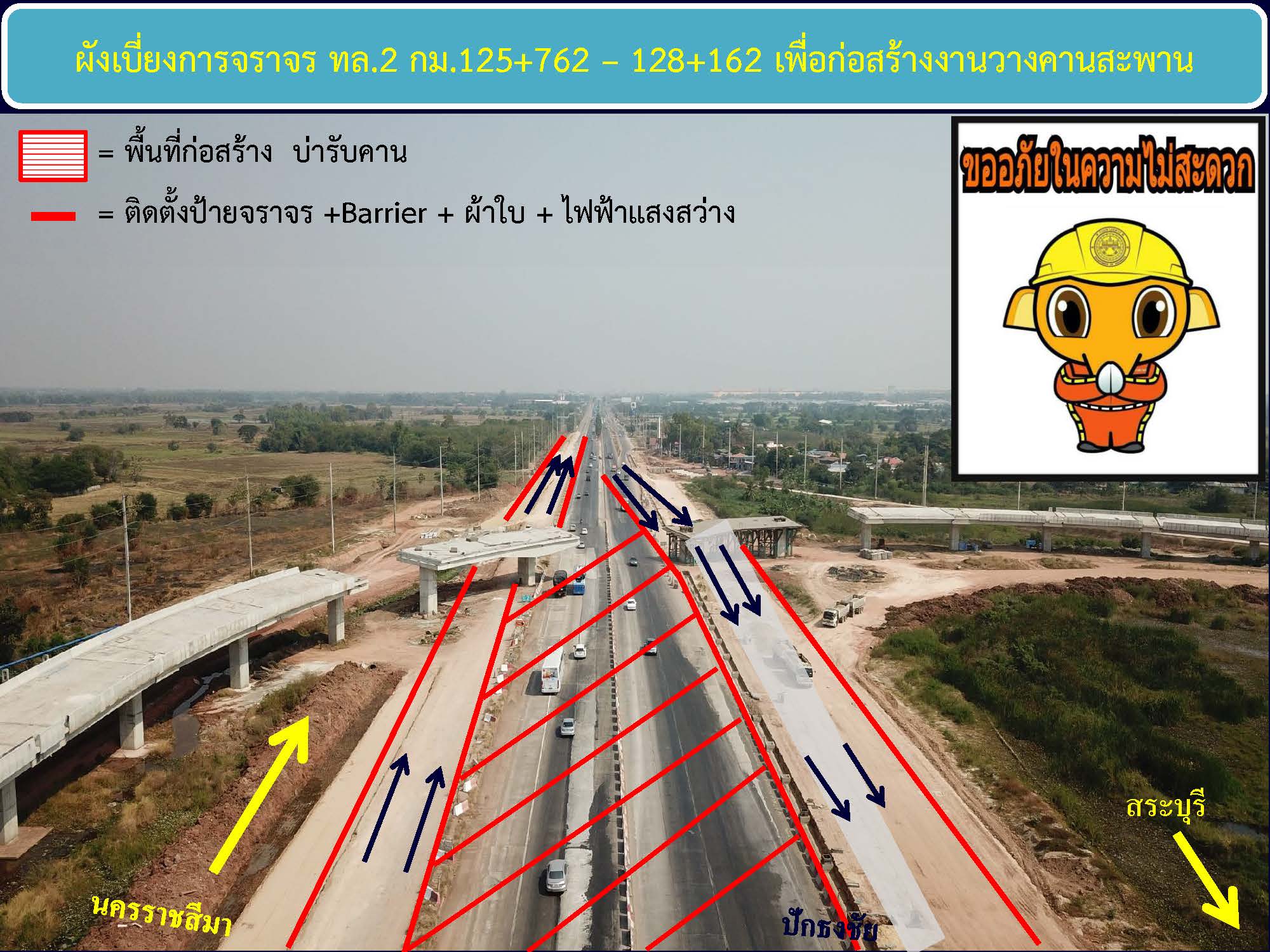แผนผังการจัดการจราจร บนทางหลวงหมายเลข 2 กม. 125+762 - กม. 128+162 เพื่องานก่อสร้างสะพาน ตั้งแต่วันที่ 27 กุมภาพันธ์ 2563 จนกว่าจะแล้วเสร็จ