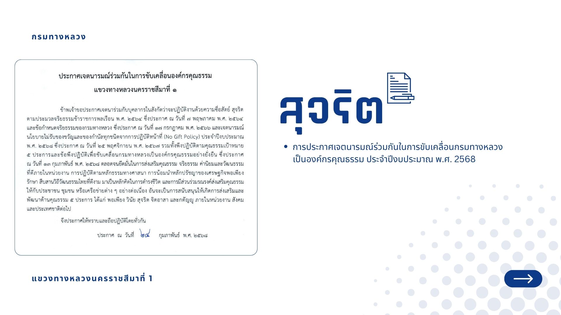 แบบรายงานผลการดำเนินงานตามแผนปฏิบัติการส่งเสริมคุณธรรมจริยธรรม แขวงทางหลวงนครราชสีมาที่ 1 ปีงบประมาณ พ.ศ.2568