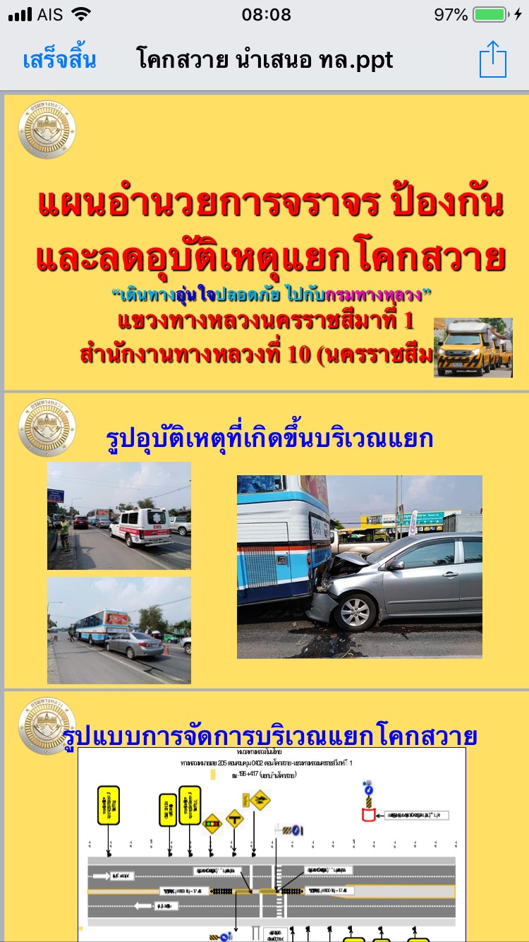 นายจักรกฤษณ์ บุญเรืองศรี ผู้อำนวยการแขวงทางหลวงนครราชสีมาที่ 1 , นายสมชาย ตังคโนภาส รอ.ขท.นครราชสีมาที่ 1 (ป) , นายอนุวัฒน์ เรืองเดชาวิวัฒน์ รอ.ขท.นครราชสีมาที่ 1 (ว) , นายเอกราช ปิดตะคุ ชม.ขท.โนนไทย พร้อมด้วย เจ้าหน้าที่เทศบาลโคกสวาย ตำรวจสภ.โนนไทย อำเภอโนนไทย และ ตัวแทนพื้นที่ชุมชนโคกสวาย เข้าร่วมประชุมหารือเรื่องแผนอำนวยการจราจร ป้องกันและลดอุบัติเหตุแยกโคกสวาย ทางหลวงหมายเลข 205 กม.196+450 ณ.สำนักงานเทศบาลตำบลโคกสวาย เพื่อหาแนวทางป้องกันอุบัติเหตุและอำนวยความสะดวกปลอดภัยให้แก่ประชาชนผู้ใช้ทางหลวง